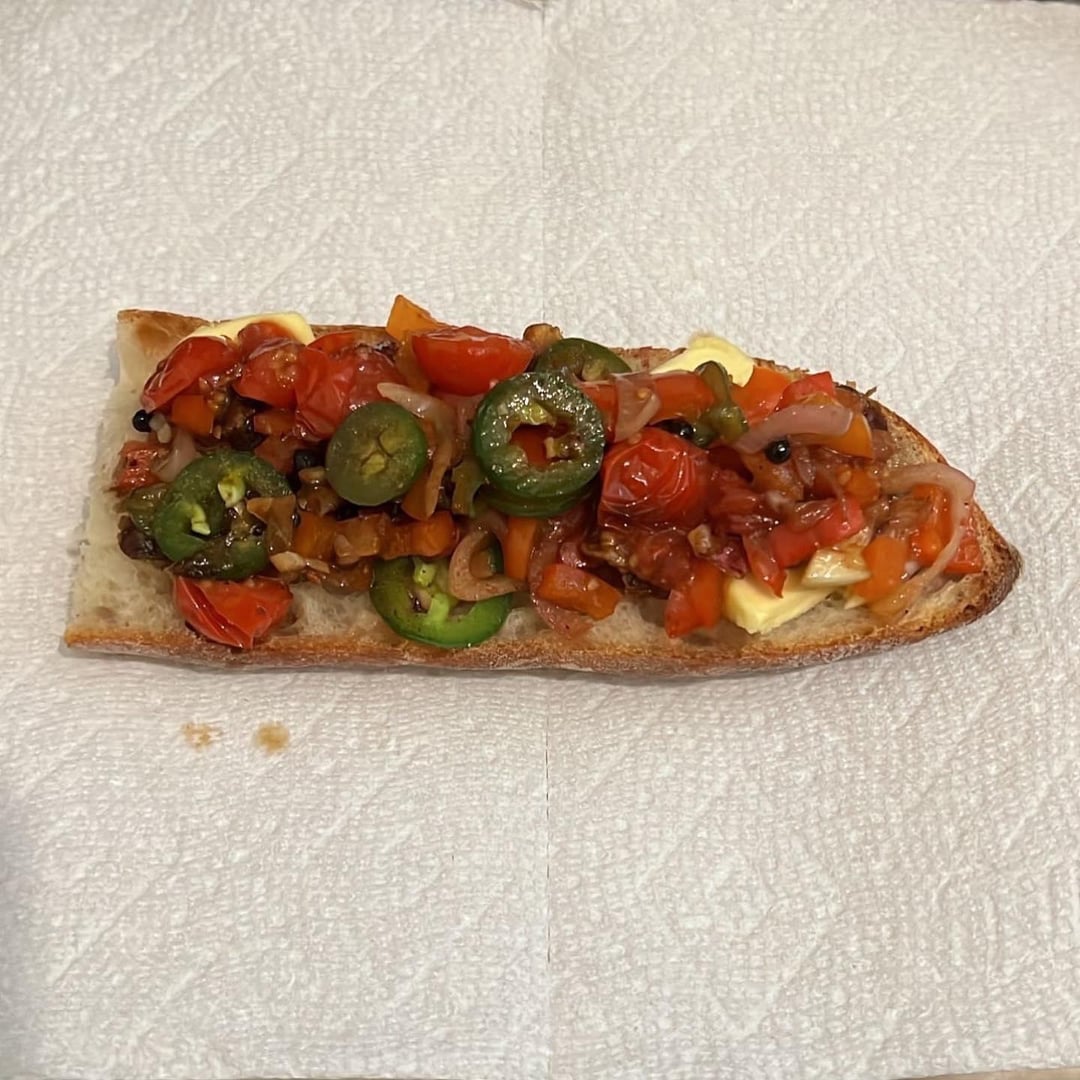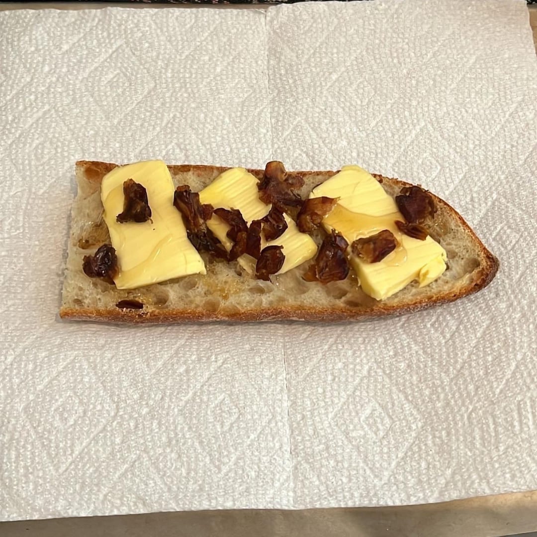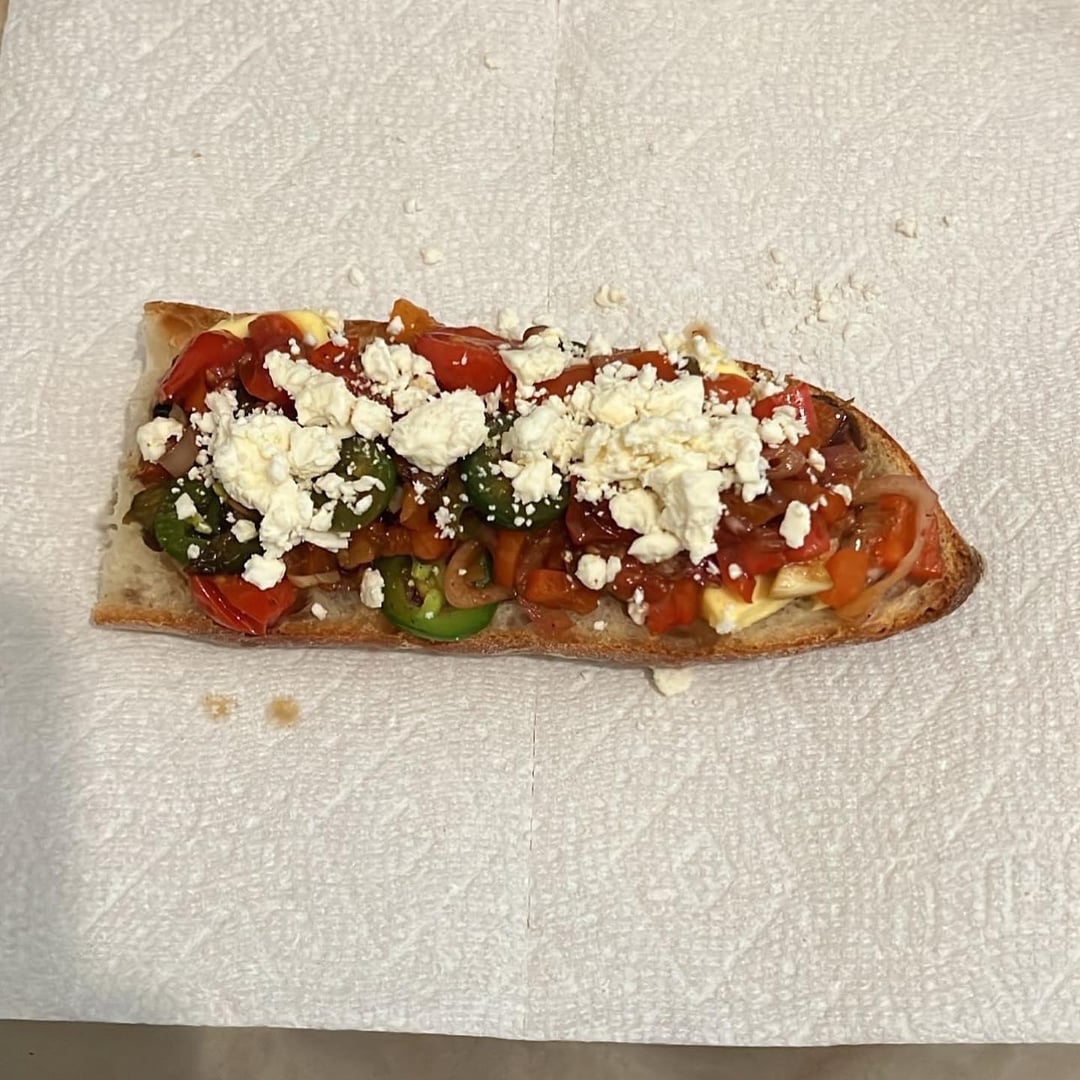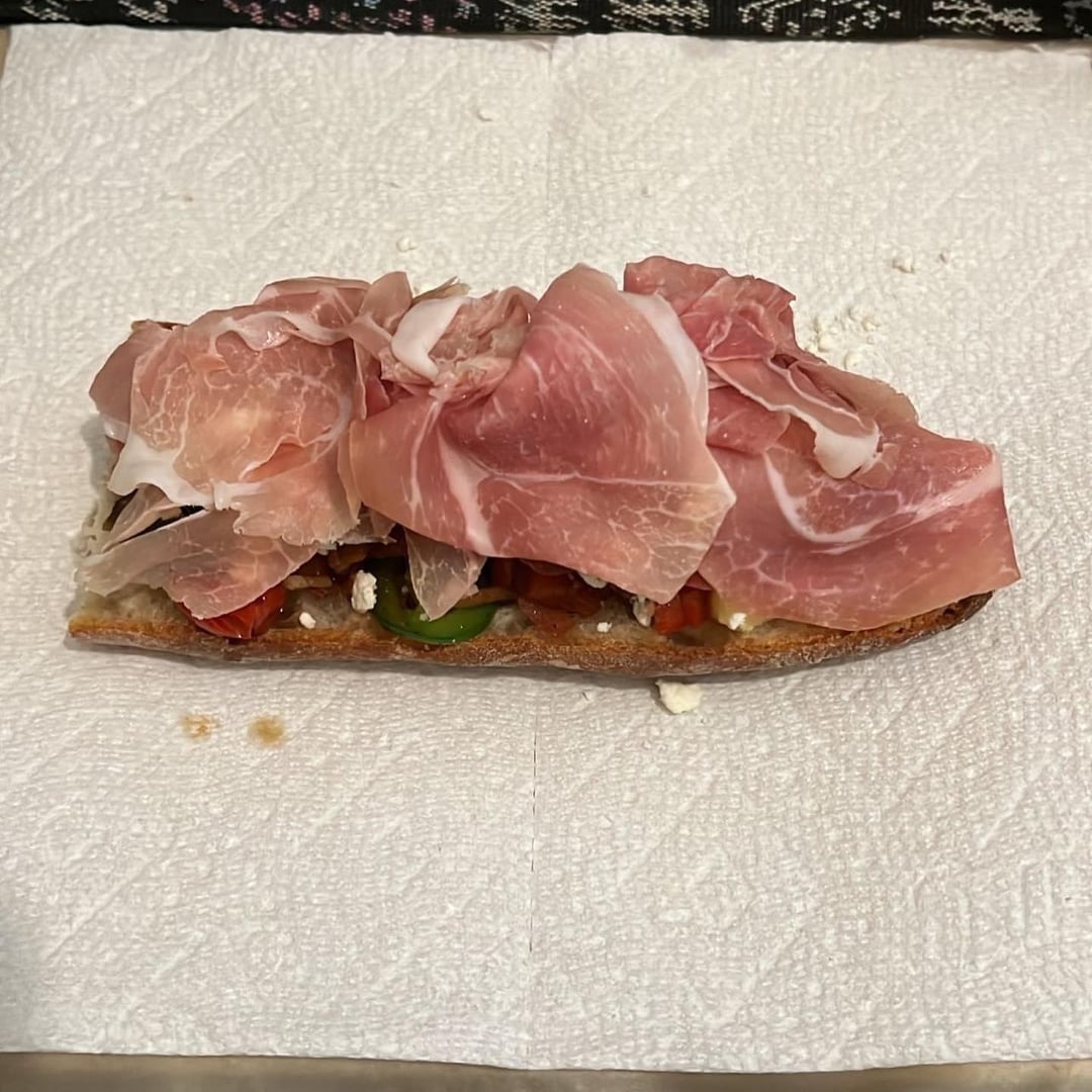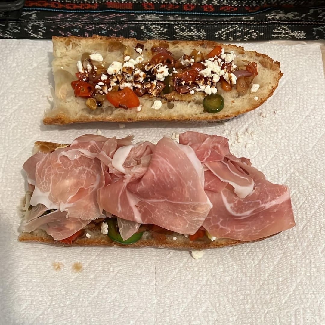 One is kerrygold butter, honey, date, sautéed shallot, garlic, flavor bomb cherry tomatoes, jalapeño, and red pepper cooked with evoo, coriander, sherry vinegar, honey, pepper, maldon salt, and fermented peppercorns with feta, prosciutto, and balsamic