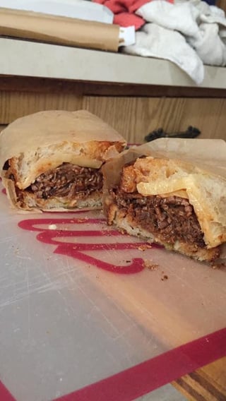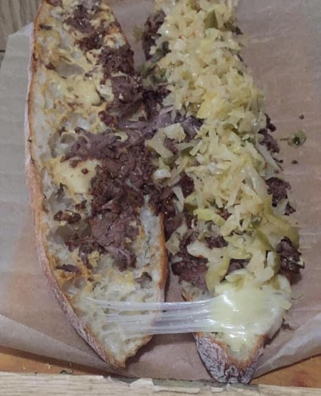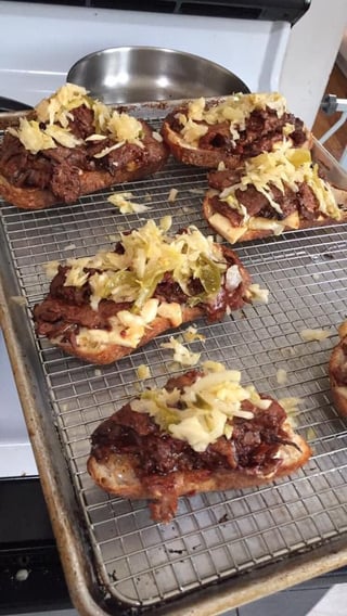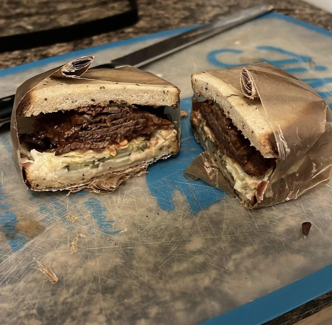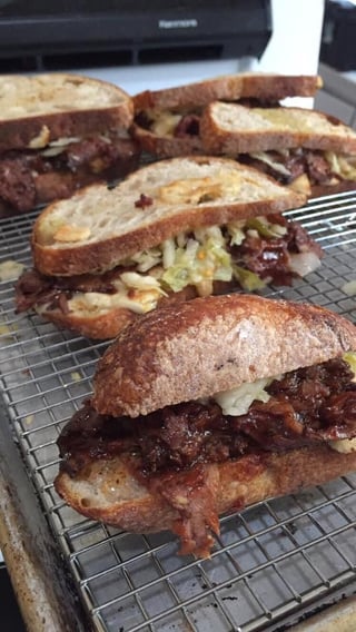 Mr. brisket bbq brisket and cold Cleveland kitchen gnar gnar kraut sandwich on a catamount cheddar and Comte melted, pickle juice, zatarins hot sauce, and el Yucatán hot sauce smothered ancienne baguette