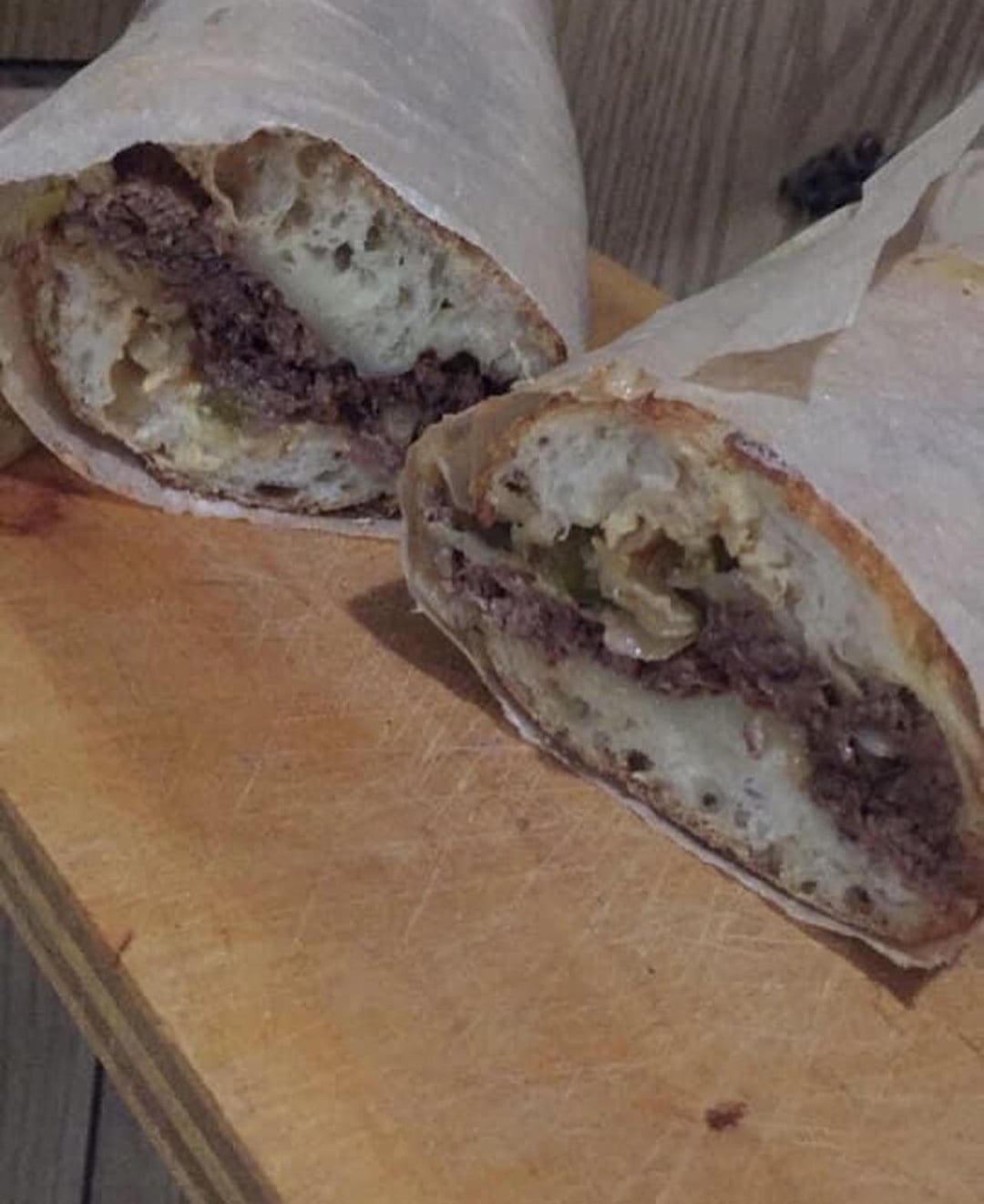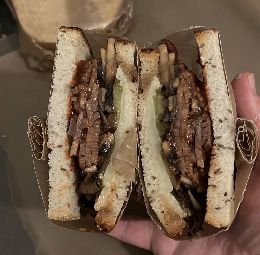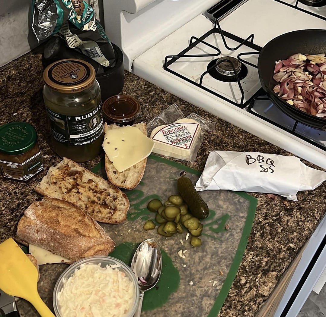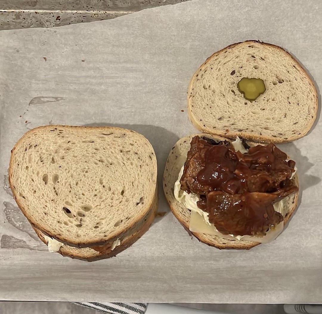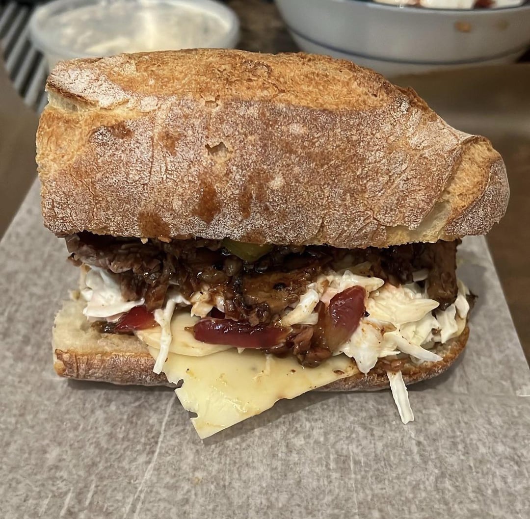 Mister brisket bbq brisket with sautéed red onions and garlic with honey, pepper, maldon salt, and sherry vinegar with cole slaw, auricchio provolone, honey cup stoneground mustard, and thinly sliced bubbies pickles on an on the rise ancienne baguette