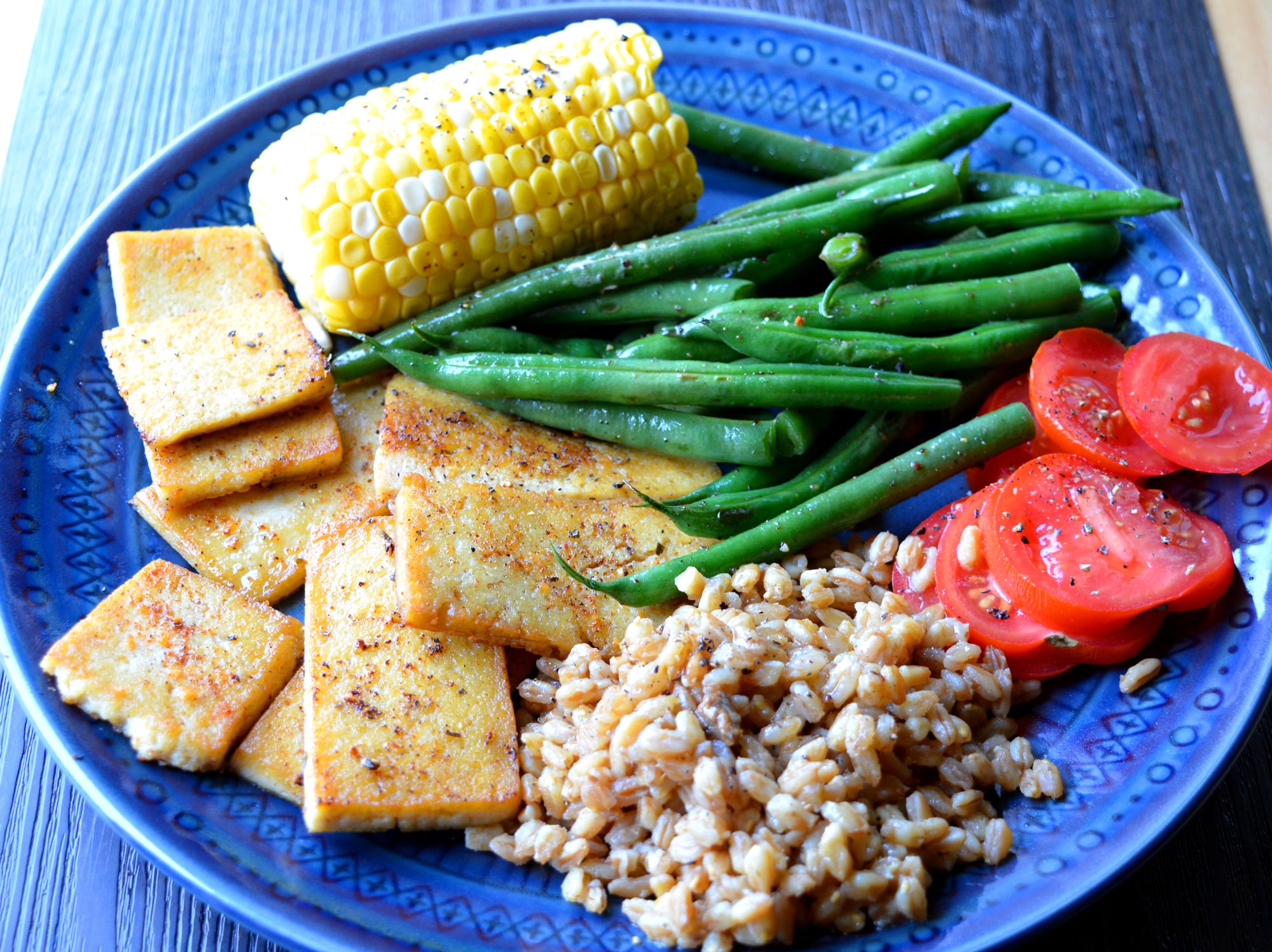 (39 g protein, 338 cals) Seasoned fava bean tofu (soy-free), mushroom farro, green beans, tomato, corn on cob
