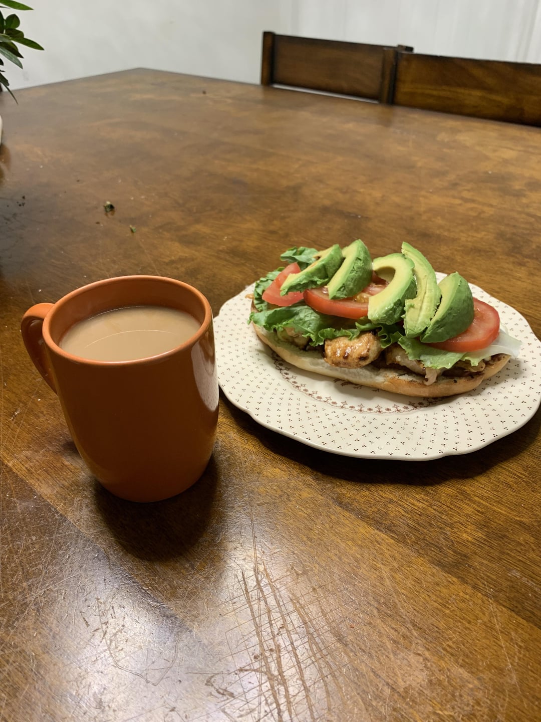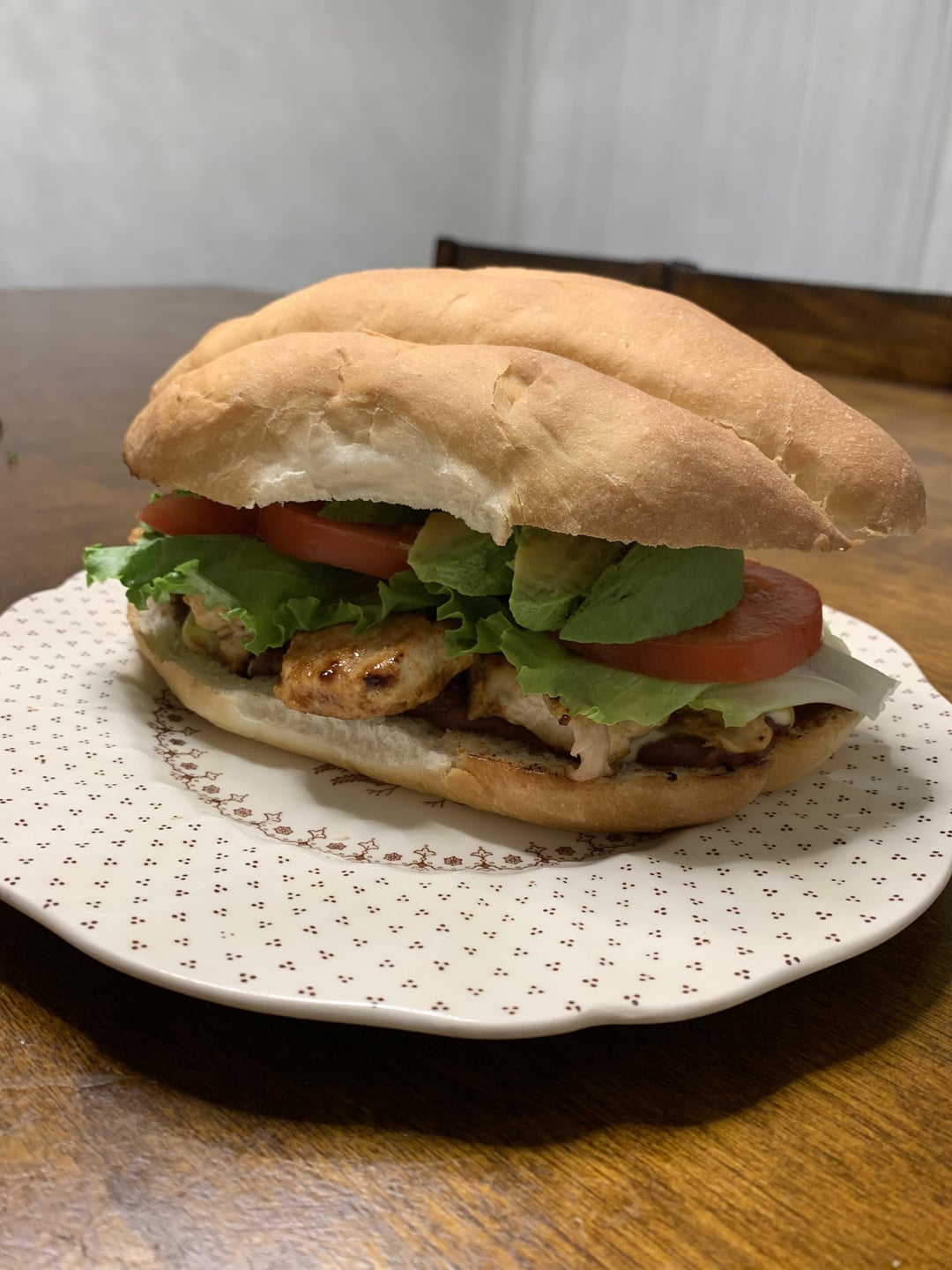Lemon chicken, refried beans, mayonnaise, lettuce, tomatoes, and sliced Avocado.
