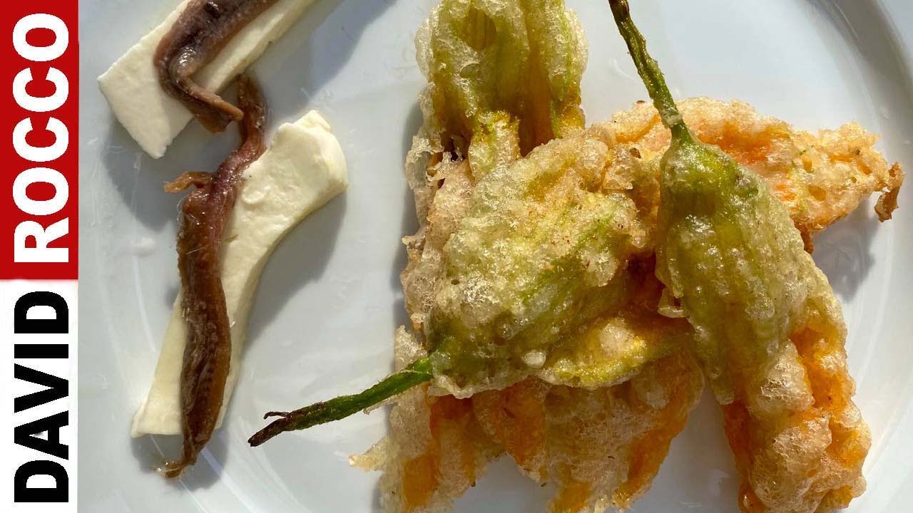 Stuff the zucchini flowers with fior di latte or mozzarella and anchovy filets.