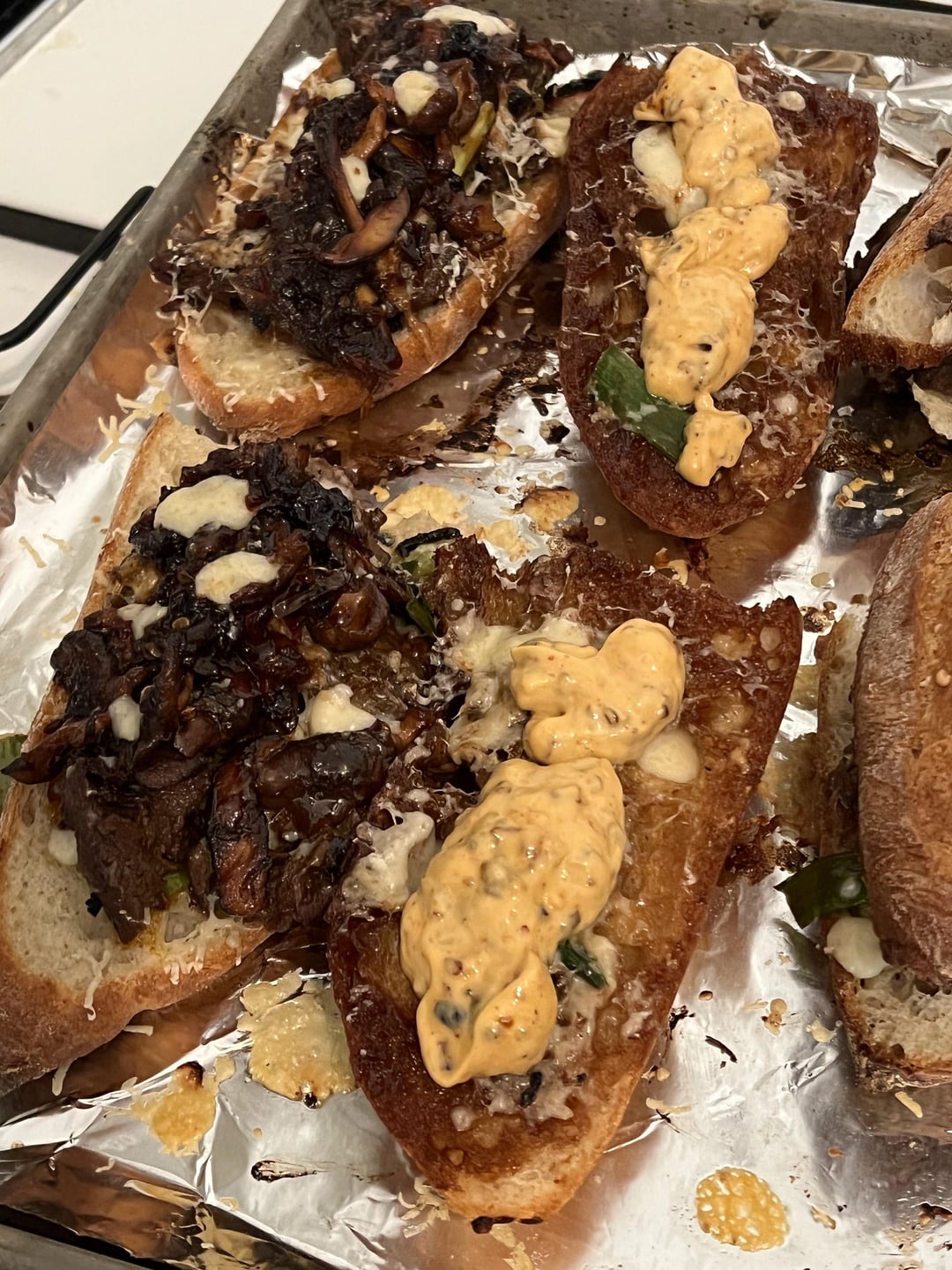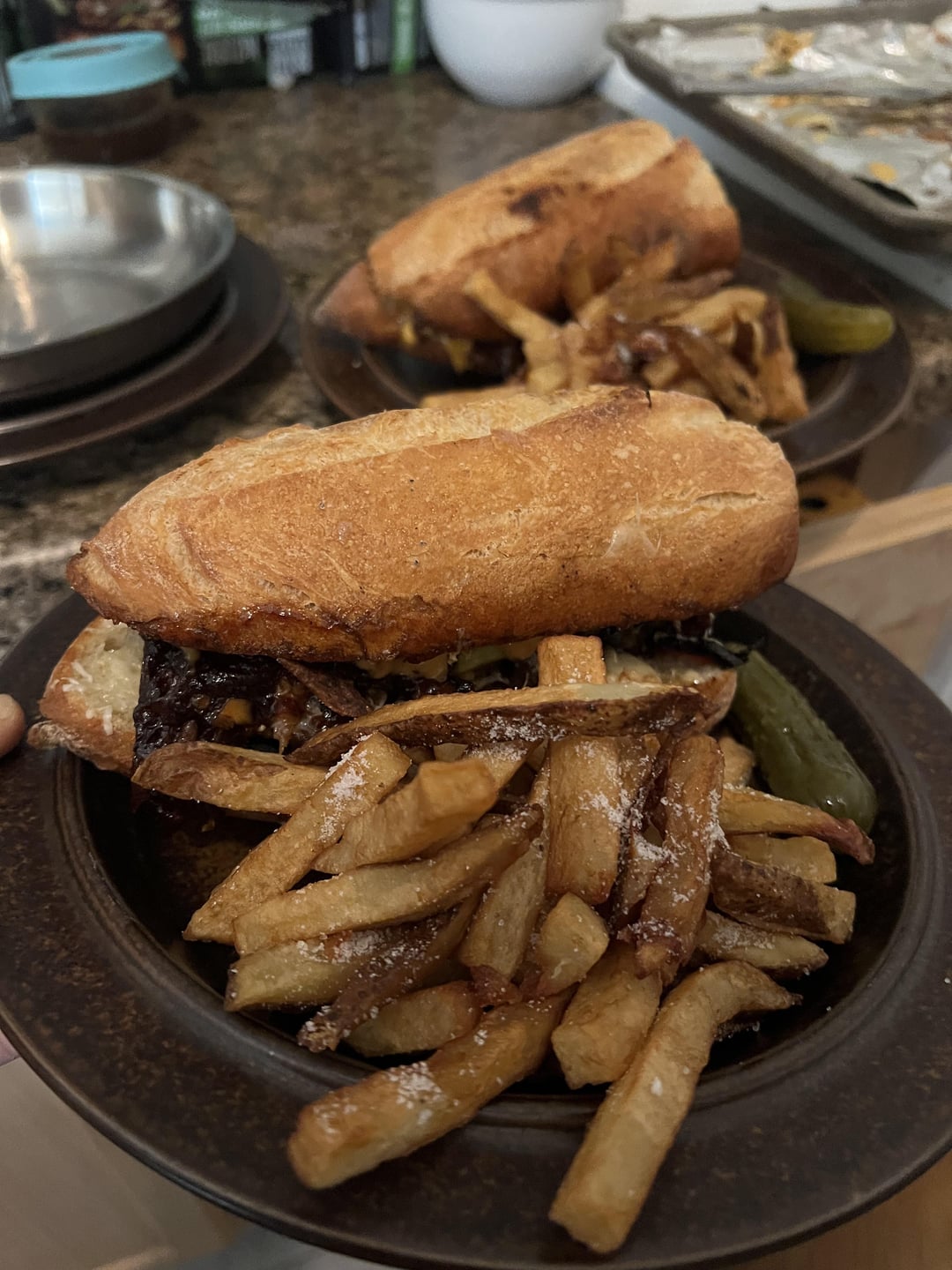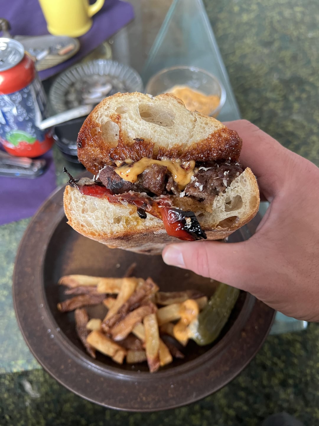 Shaved sirloin sandwich on an ancienne baguette cooked in sautéed shallot, garlic, Thai pepper, green onions, ban Chan bbq sauce, chinkiang vinegar, shaoxing rice wine, isigny spring butter, maldon salt, and pepper with sautéed red onion, red pepper, and shiitakes cooked in evoo, garlic, Thai peppers, chicken stock, honey, and balsamic with melted unexpected cheddar, and a sauce made out of dukes mayo, chinkiang vinegar, and Lao Gan Ma Spicy Chili Crisp with truffle fries and a bubbies pickle