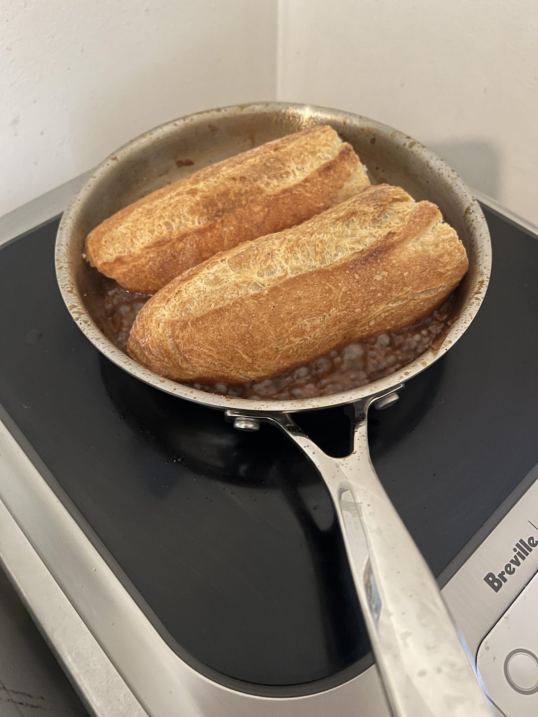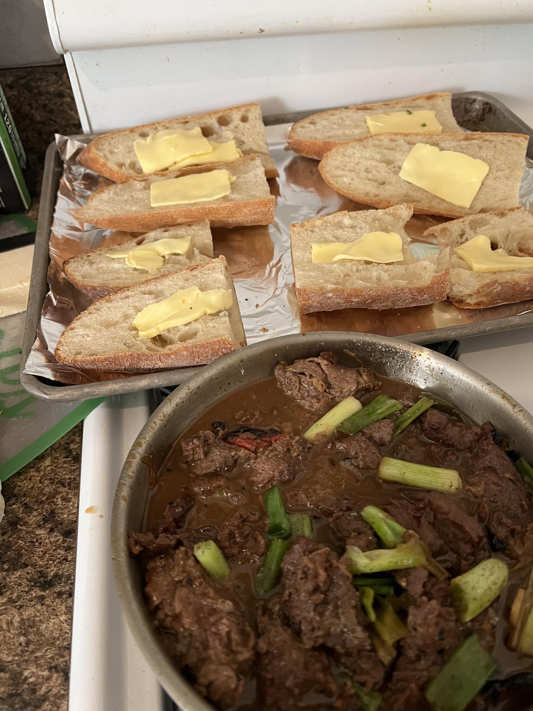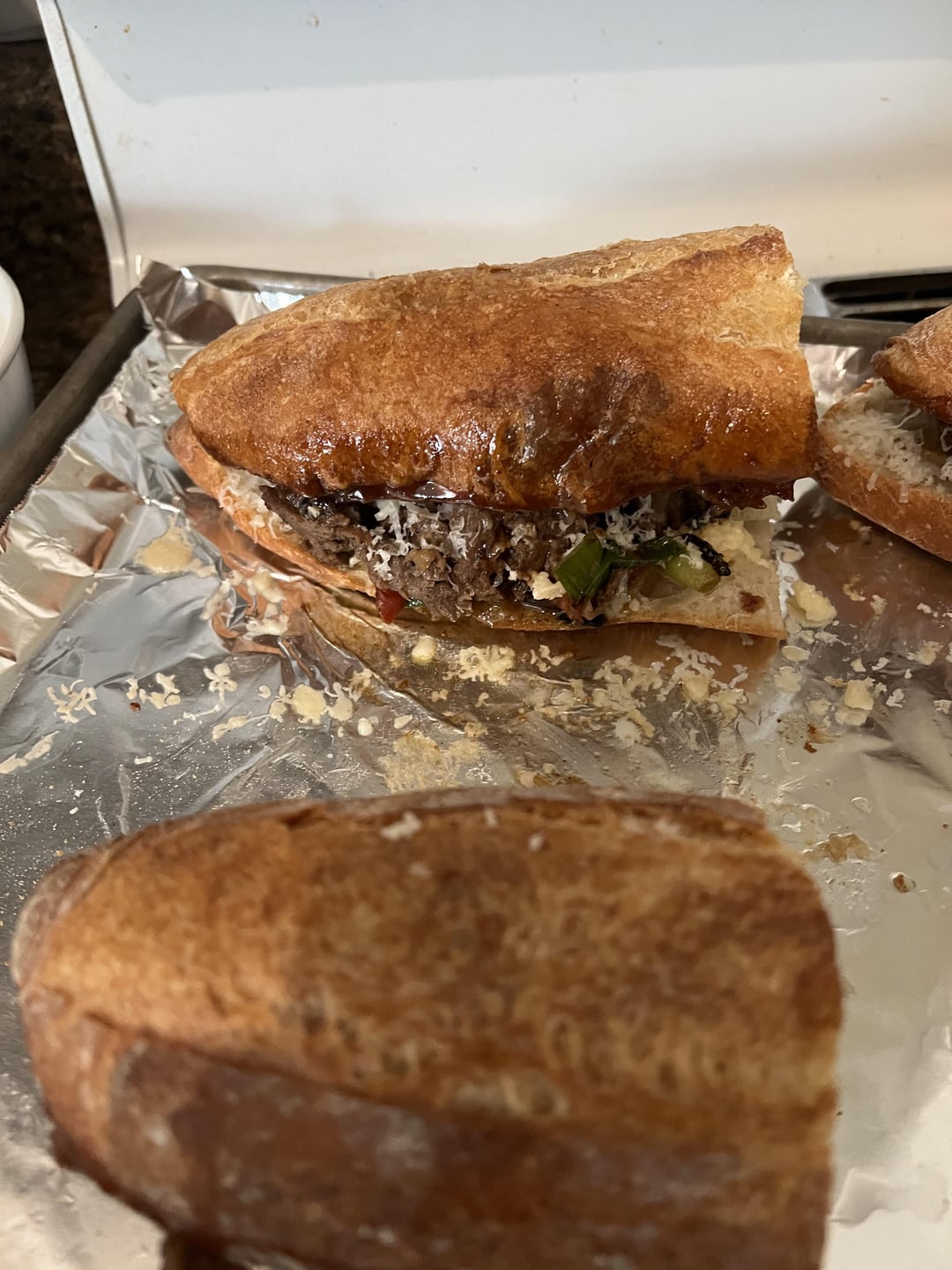 Shaved sirloin sandwich on an ancienne baguette cooked in sautéed shallot, garlic, Thai pepper, green onions, ban Chan bbq sauce, chinkiang vinegar, shaoxing rice wine, isigny spring butter, maldon salt, and pepper with sautéed red onion, red pepper, and shiitakes cooked in evoo, garlic, Thai peppers, chicken stock, honey, and balsamic with melted unexpected cheddar, and a sauce made out of dukes mayo, chinkiang vinegar, and Lao Gan Ma Spicy Chili Crisp with truffle fries and a bubbies pickle