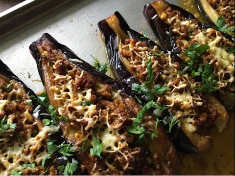4. Place the eggplant into a ovenproof dish or a baking tray. Spoon the filling into the splits. Top with grated cheese. Bake in preheated oven for about 10 minutes. Season with chopped parsley.