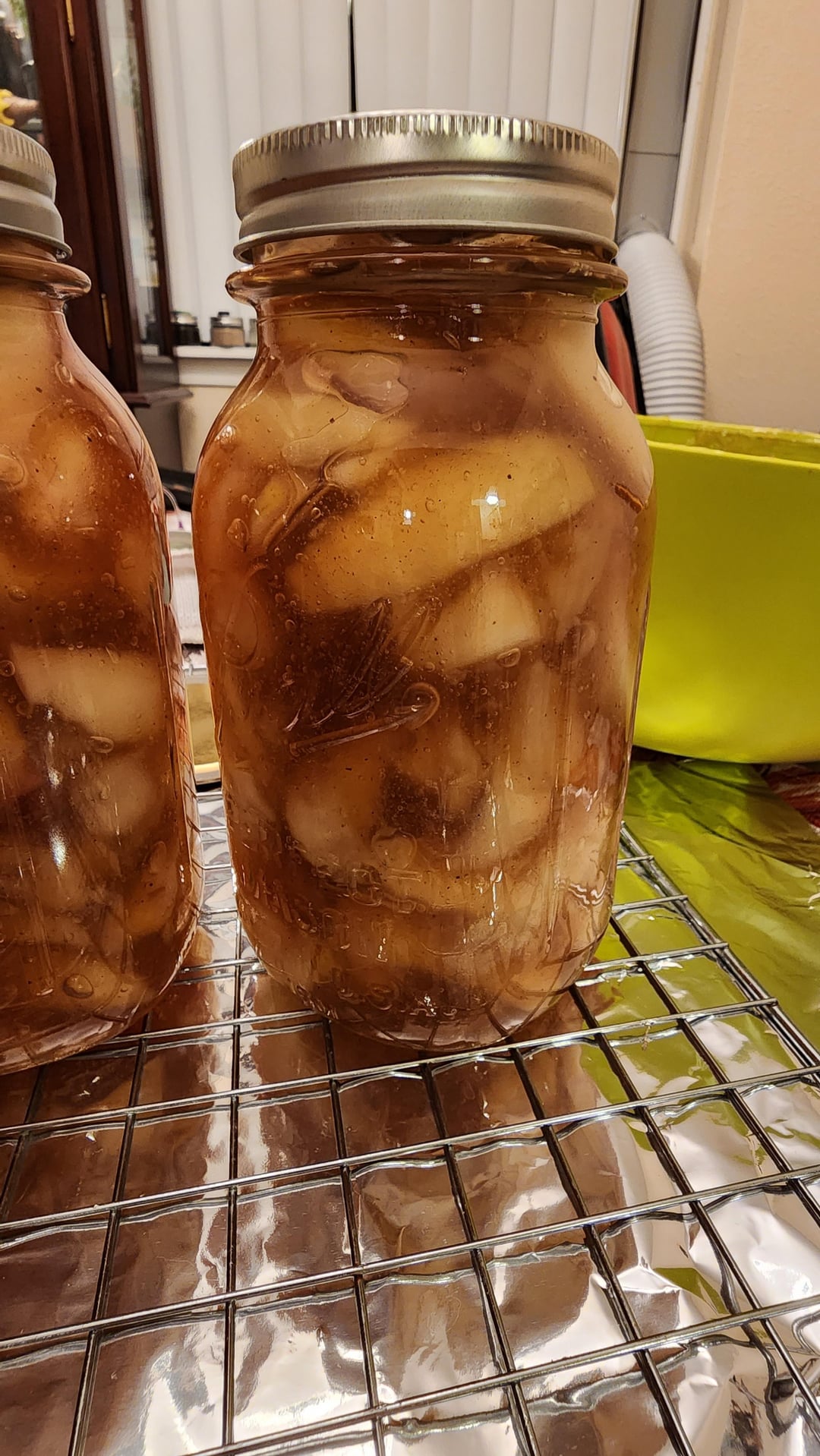 Image 1: multiple jars of apple pie filling on a cooling rack