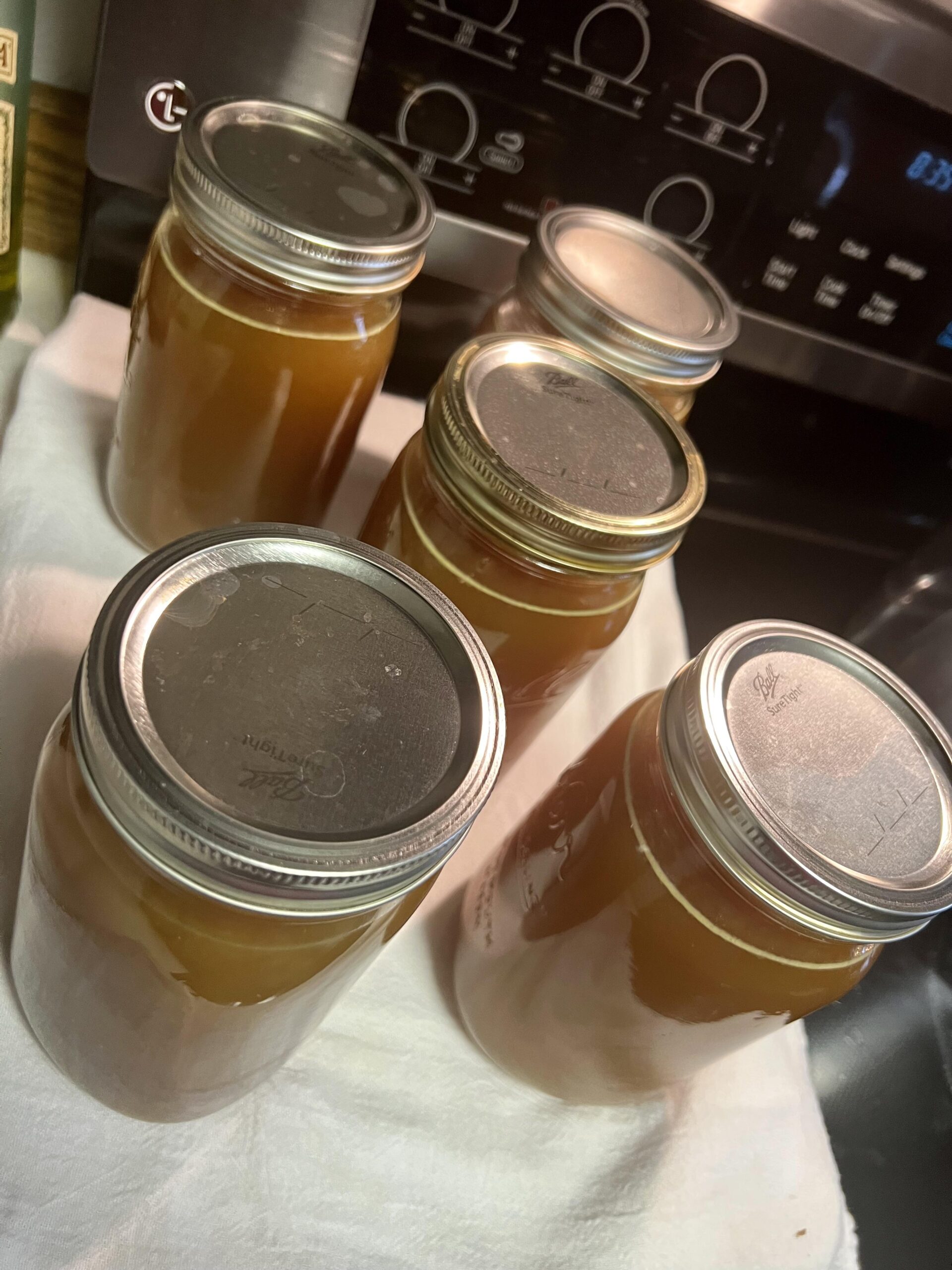 After it all cooled, the resulting jars were messy with turkey fat and stock residue, but the lids were tightly secured. I cleaned them up with soap and water and put them away for later use.