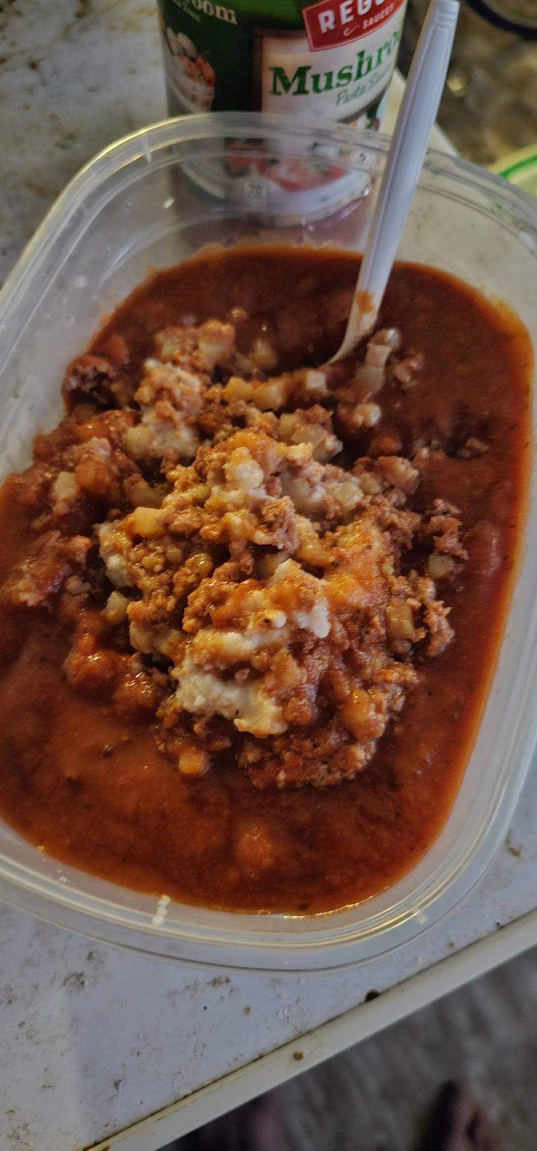 Corned beef hash with mashed potatos and pasta sauce, cheap and easy by goatorcycle Write A CommentYou must be logged in to post a comment.