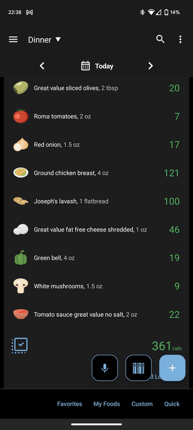 I tried a homemade pizza, cost me about $3 without including the cost of spices. Pretty filling for only 360 calories. Ingredients in comment, 2nd picture is my entry in MyNetDiary for the meal.