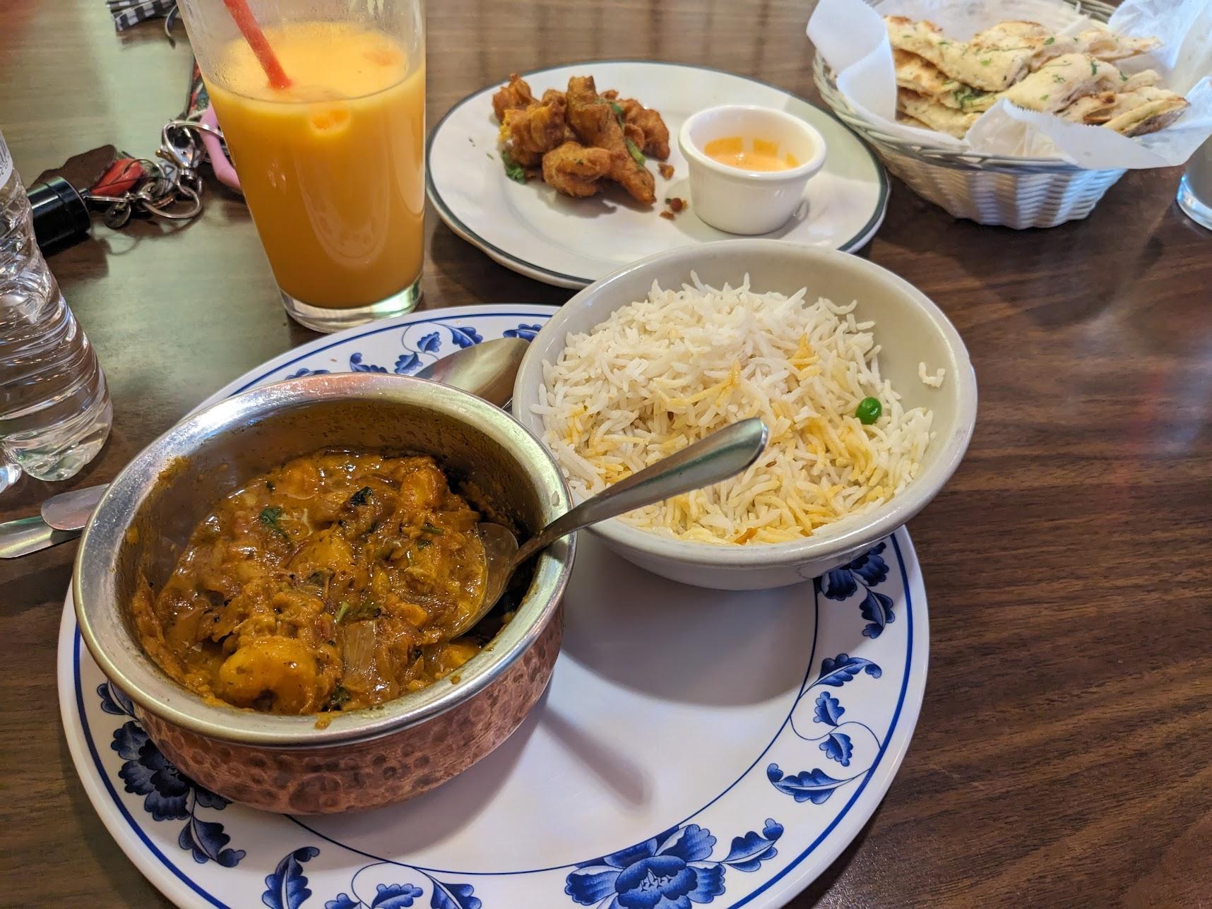 First time eating there. My husband and I got the seafood curry, goat curry, garlic naan, cheesy jalapeno naan, fish pakora, mango lassi, and sweet lassi.