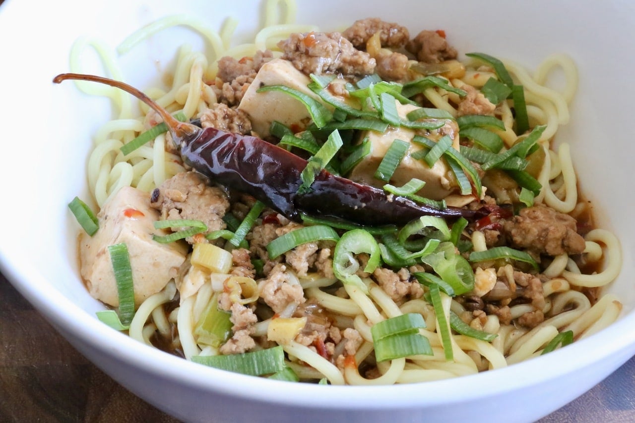 * 3 tbsp Canola Oil * 4 Dried Red Chilies * 1/2 lb Ground Pork * 3 tbsp Chinese Rice Wine * 2 tbsp Black Bean Garlic Sauce * 2 tbsp Doubanjiang Chinese Chili Bean Paste * 2 tsp Soy Sauce * 1 tsp White Sugar * 1/2 tsp Black Pepper * 1 tsp Sesame Oil * 1/2 tsp Sichuan Pepper * 2 Scallions whites and greens separated, chopped * 2 Garlic Cloves minced * 1 tsp Ginger minced * 3 cups Chicken Stock * 1/2 lb Medium Firm Tofu drained, cut into 1-inch cubes * 3 tbsp Cornstarch mixed in 1/4 cup water * Kosher Salt * 32 oz Fresh Ramen