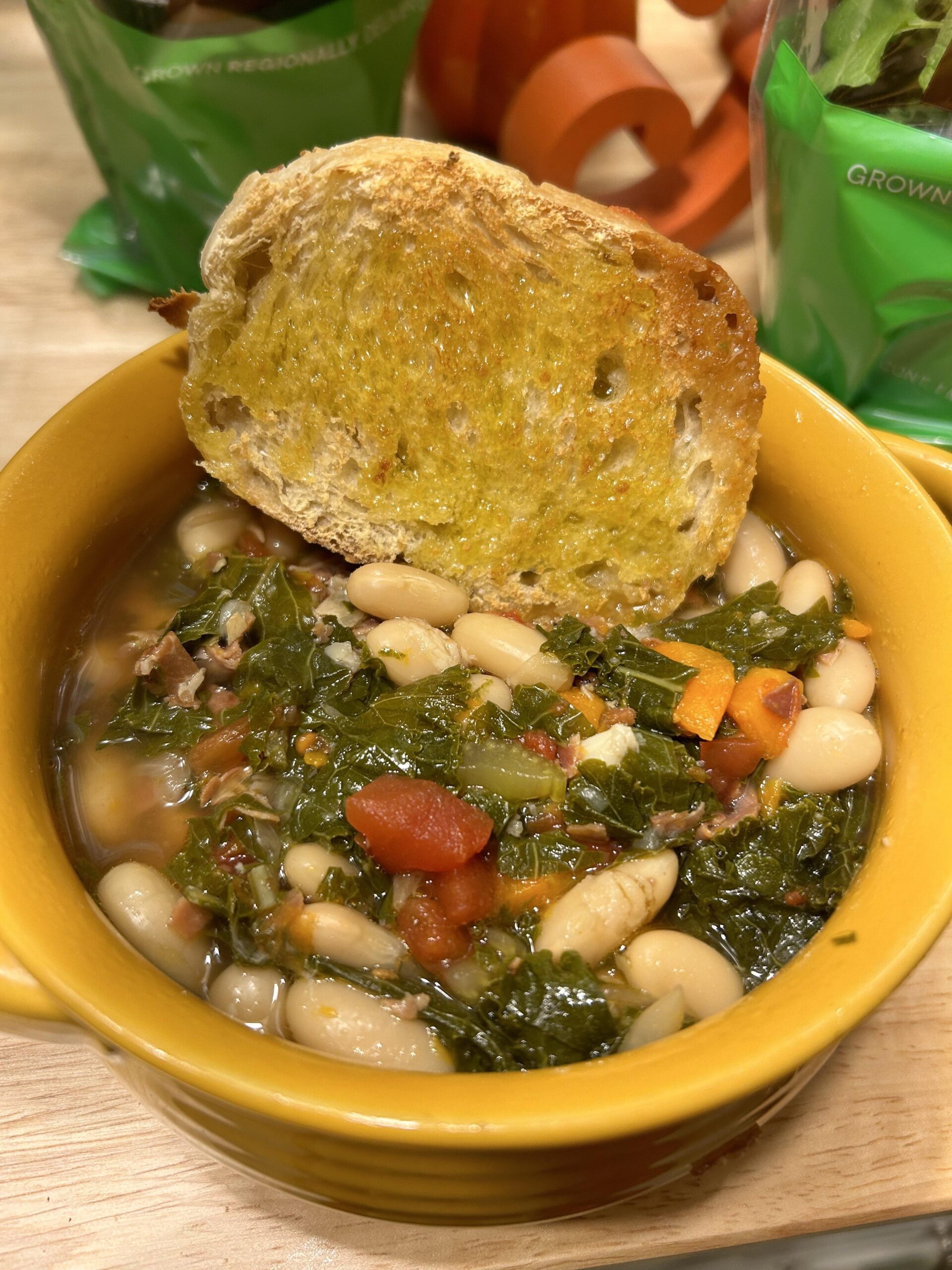 So I used 6 oz of prosciutto that I cut into tiny bite size pieces, cooked it in some olive oil until Browned. I then added two celery ribs cut into 1/2 inch slices , two large carrots cut into 1/2 inch pieces and a whole medium white onion chopped. I cooked those for about 15 minutes until they started to get a little soft. I added 8 cloves of smashed garlic and cooked for about one minute. I added 6 cups of low sodium chicken broth , 1 lb of chopped and stemmed kale.. two fresh bay leaves and 1 (14.5 oz) can of drained diced tomatoes. I put the lid on the Dutch oven and placed it in the oven at 225 degrees for 40 minutes. I removed it and put 5 cans of drained cannellini beans into the pot with two fresh sprigs of rosemary. I put the lid on and simmered on the stove for about 15 minutes . I added some salt and pepper for taste and served with toasted sour dough with olive oil . I got the recipe from the atk Mediterranean cookbook but tweaked it a little (didn’t use dried beans etc) . Enjoy !!