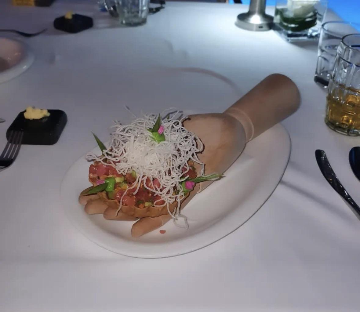 Pity about the hand because the food is very pretty. No idea on the country.