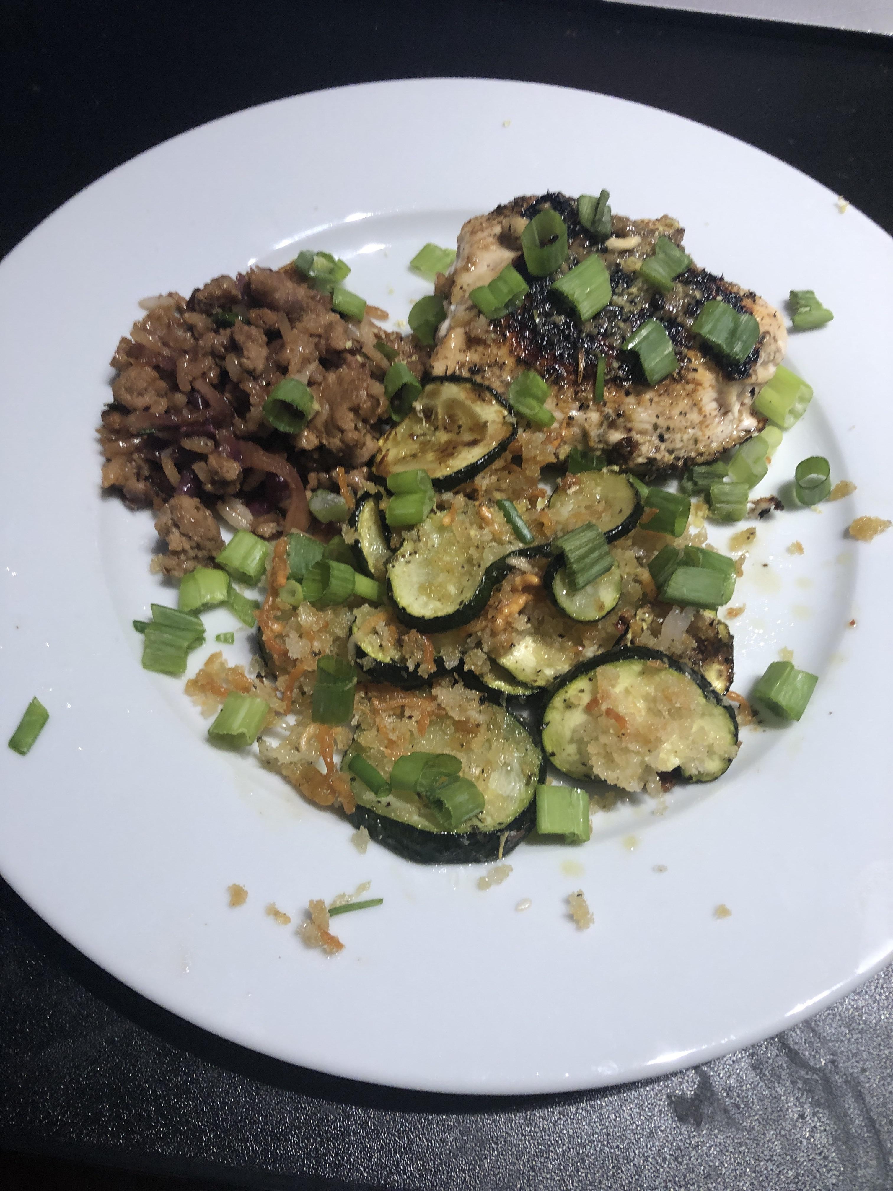 So, I made some changes to tonight’s meal. It normally comes with couscous as one of the sides, but I am not a fan of couscous (texture issues) so I just replaced it with last nights leftovers, which thankfully also work as a side as it is a bowl (Moo Shu Pork). Very delicious, and the zucchini rounds with the cheese were so good as well!! 🙂