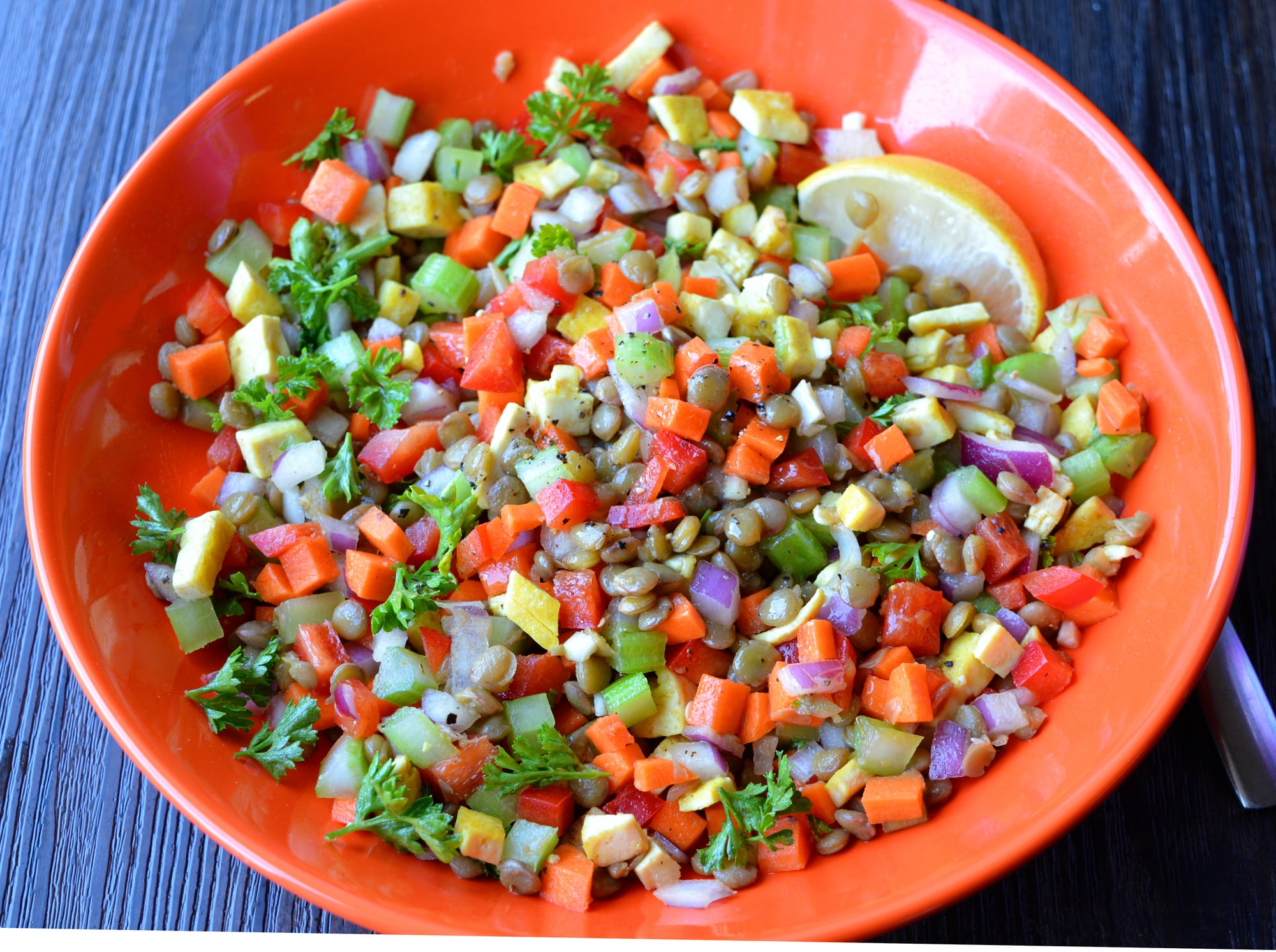 * 1/2 c dry lentils cooked with bay leaf and Better than Bouillon no-chicken seasoning * 95 g carrots * 97 g celery * 55 g red onion * 1/4 c chopped parsley * 2 servings Big Mountain fava bean tofu * 85 g red bell pepper ** * dressing: lemon juice, 1.5 tsp olive oil, 1/2 clove garlic minced, salt, pepper, sweetener (all to taste)