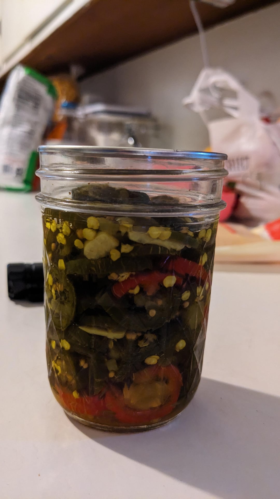 I water bath canned some candied jalapenos a couple days ago using the ball recipe. I had a lot of liquid left over, but checked here and it seems like that’s expected and ok. I packed the peppers in pretty tight and them filled each jar with enough liquid to cover the peppers at 1/2 inch headspace. However, once they were done processing, it looks like the line of the liquid has receded a bit down and there’s a thin layer of peppers exposed at the top with no liquid covering them. Is that safe for shelf storage? The peppers simmered in the vinegar liquid for 15 minutes as directed. Thanks in advance!