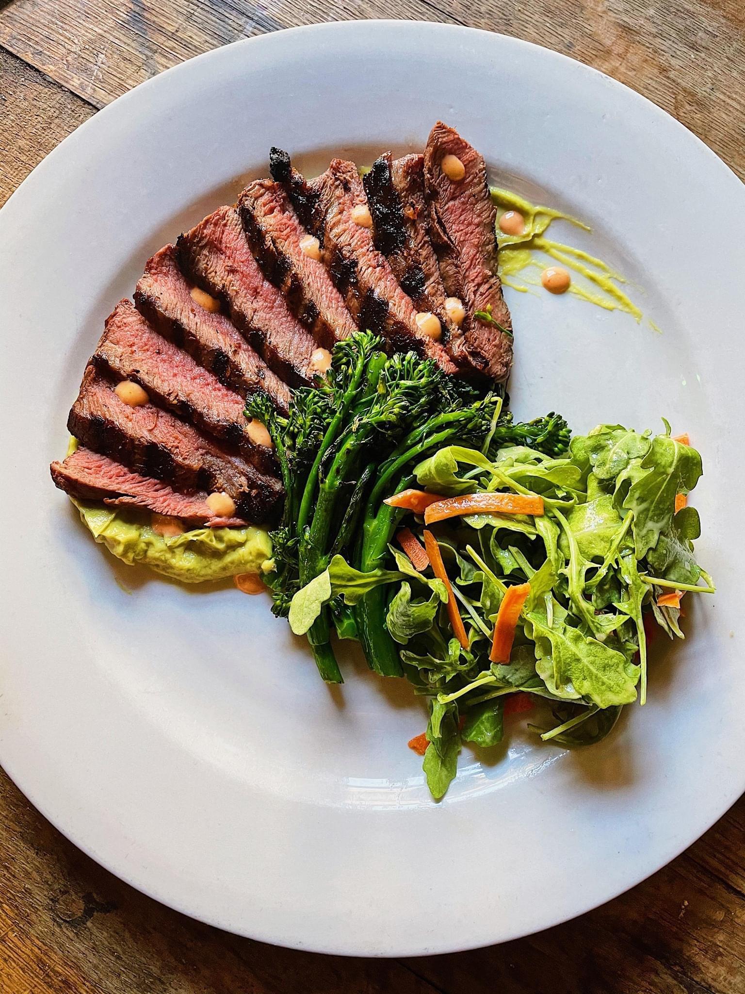Miso rubbed flank steak Med rare / avocado purée / miso and chilie emulsion / arugula salad with hot pickled carrot / rice wine vinaigrette/ grilled baby broccoli.