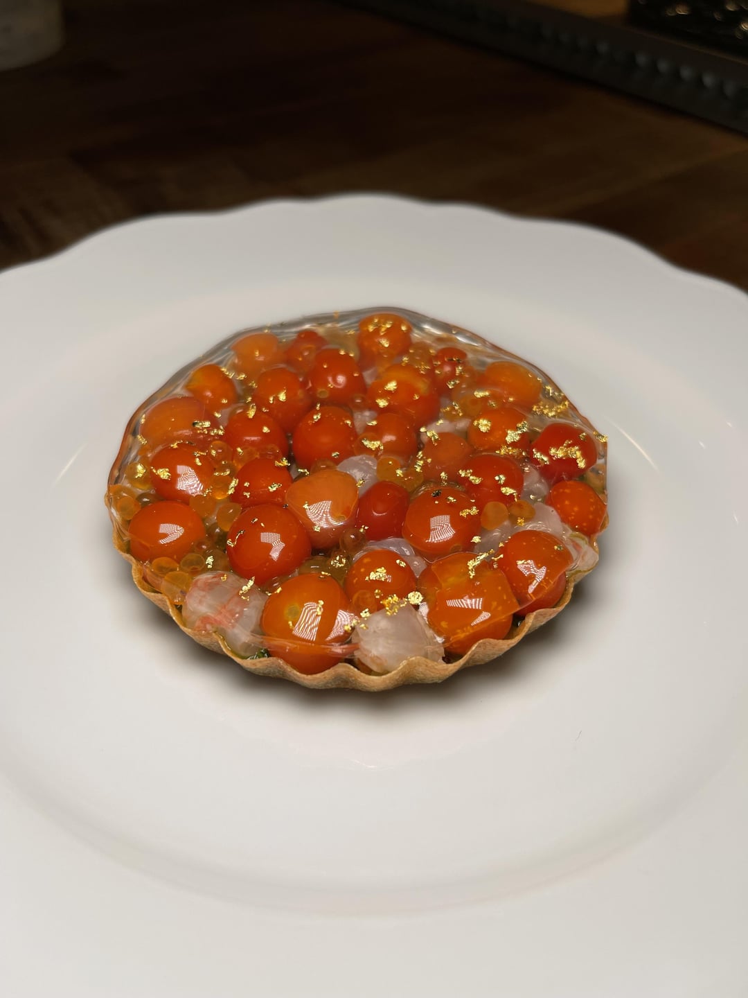 It’s gorgeous and I think we all want to know a bit more detail about what’s happening here. Confit tomato? Or stewed? Looks like salmon roe with raw looking shrimps, some kind of clear polymer gel with gold leaf in it?
