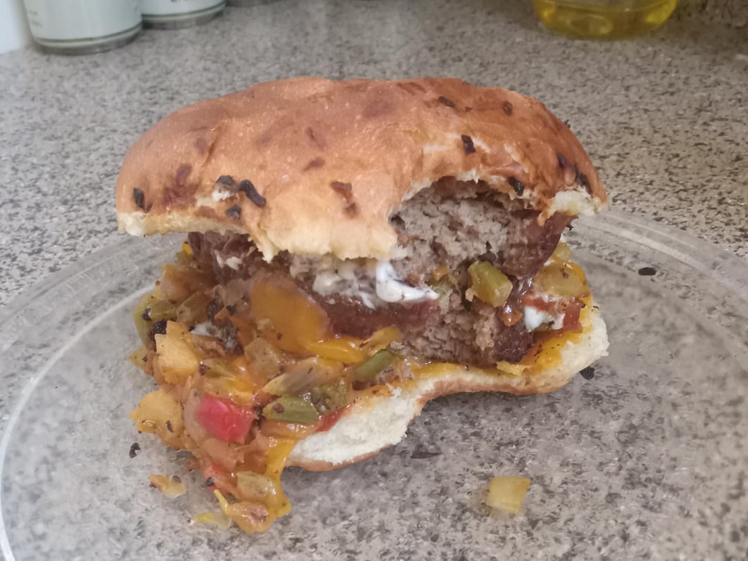 Double Bacon Cheddar Angus Burger On An Onion Roll With Hot Peppers, Mayo, And Jalepeno Ketchup.by sometimes_stupid00 Write A CommentYou must be logged in to post a comment.