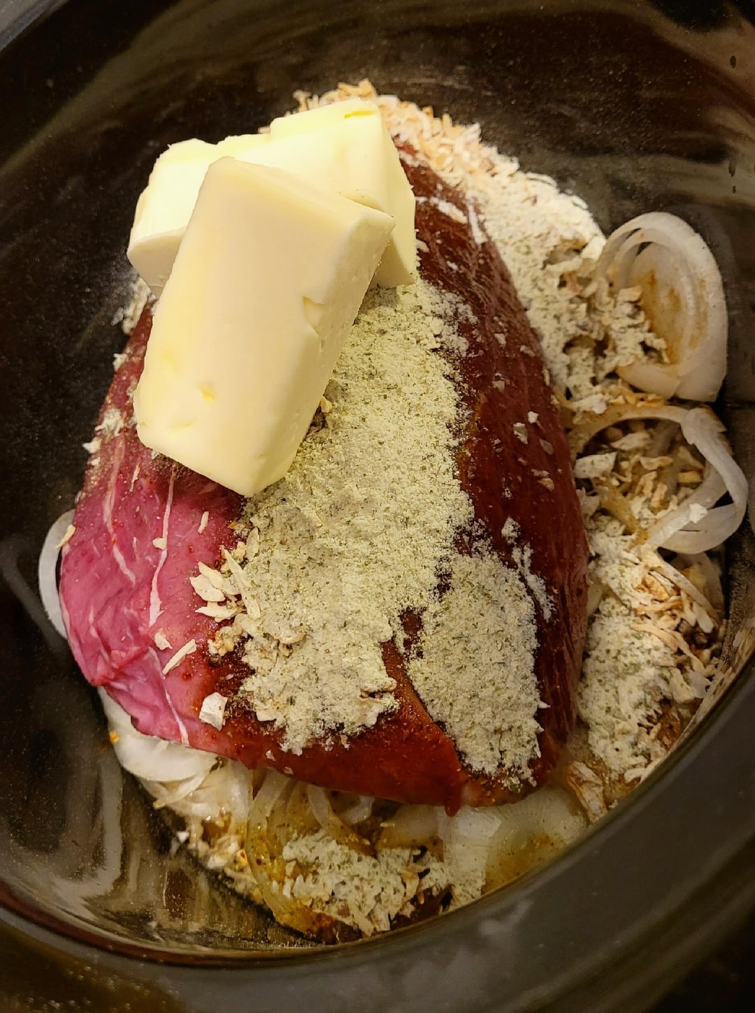 I made bread and piled it with roast and gravy over aged cheddar. The original ingredients were a 4lb roast, pickle juice, sliced onions, onion soup mix, spicy ranch seasoning packet, gravy packet, and a stick of butter 🙂