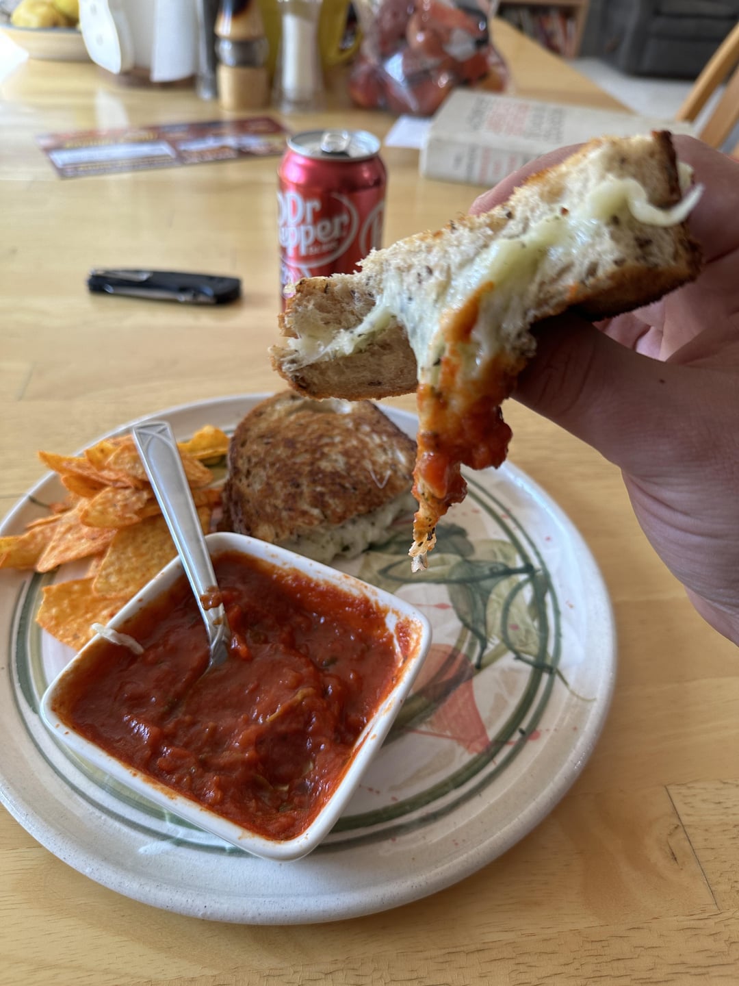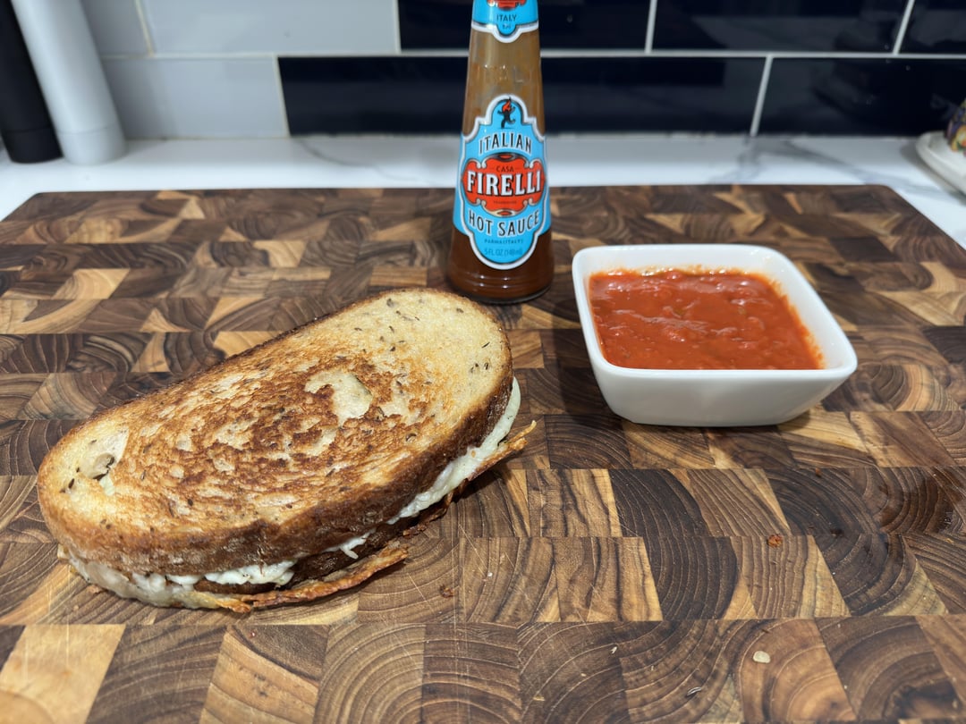 mozz with italian seasoning on rye with some leftover marinara i spiked with hot sauce.