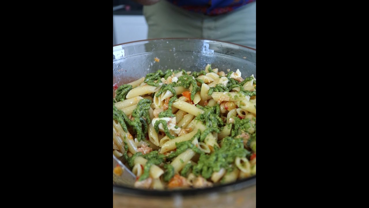 Delicious 10 minute pasta salad using Wild Planet Ready-to-eat Wild Tuna White Bean Salad. Add pasta, a little burrata cheese, some homemade pesto and a sprinkling of pistachios, and you have a tasty pasta salad perfect for a summer picnic.