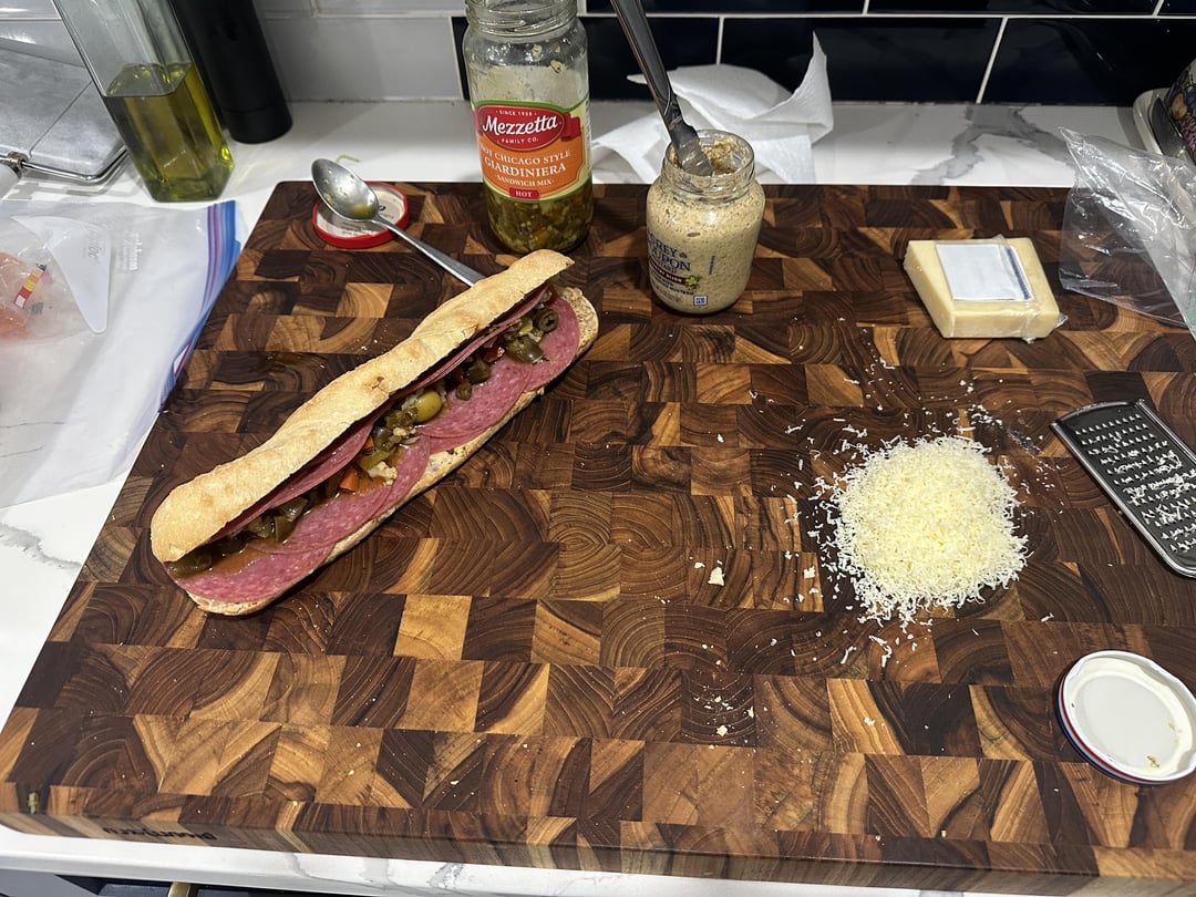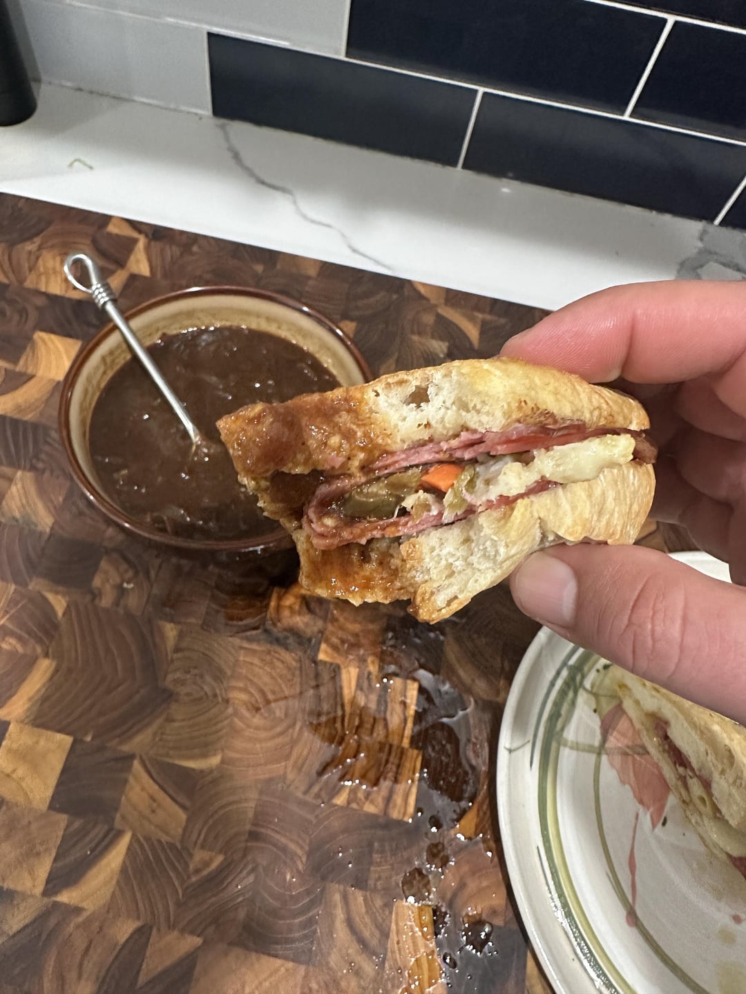 salami, dijon, giardiniera and gruyère on a baguette w/ homemade french onion soup.by icutfarts 3 Comments YaBoiErr_Sk1nnYP3n15 2 years ago Hell ye brother CanoeIt 2 years ago Marry me Champenoux 2 years ago And no plate for them!What is giardiniera? Oh, pickled vegetables.Write A CommentYou must be logged in to post a comment.