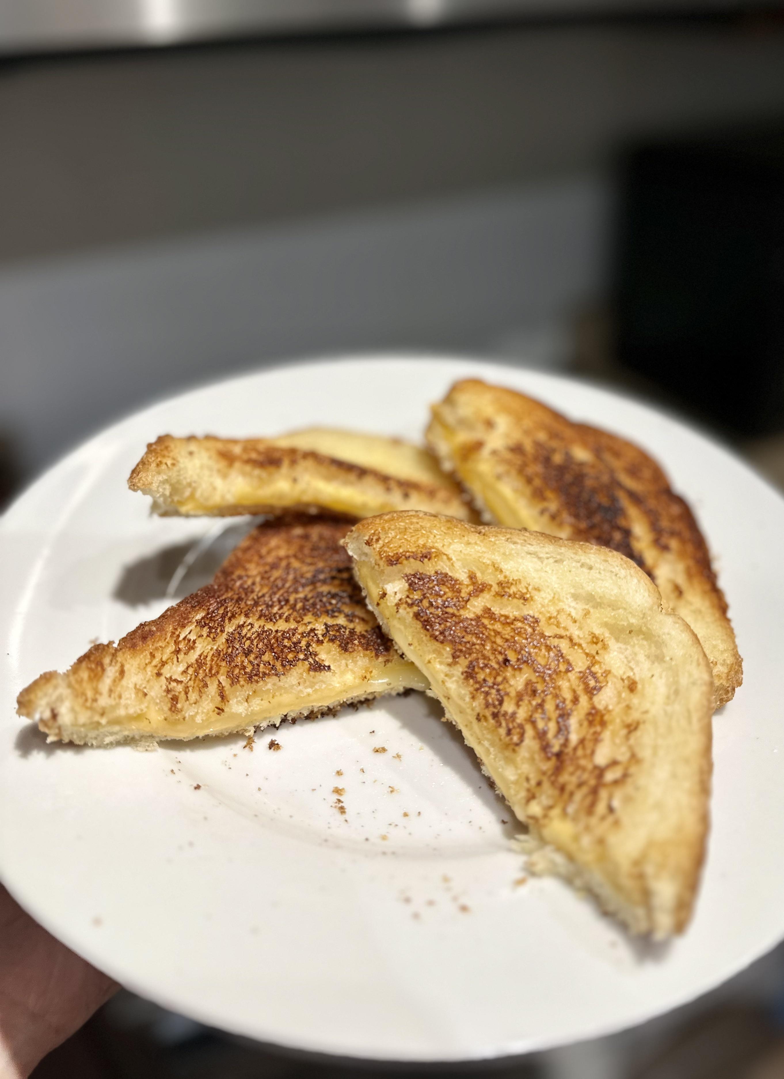 Grilled cheese sandwiches. White bread, butter, Kraft deli deluxe American and applewood smoked white cheddar cheese slices 👌