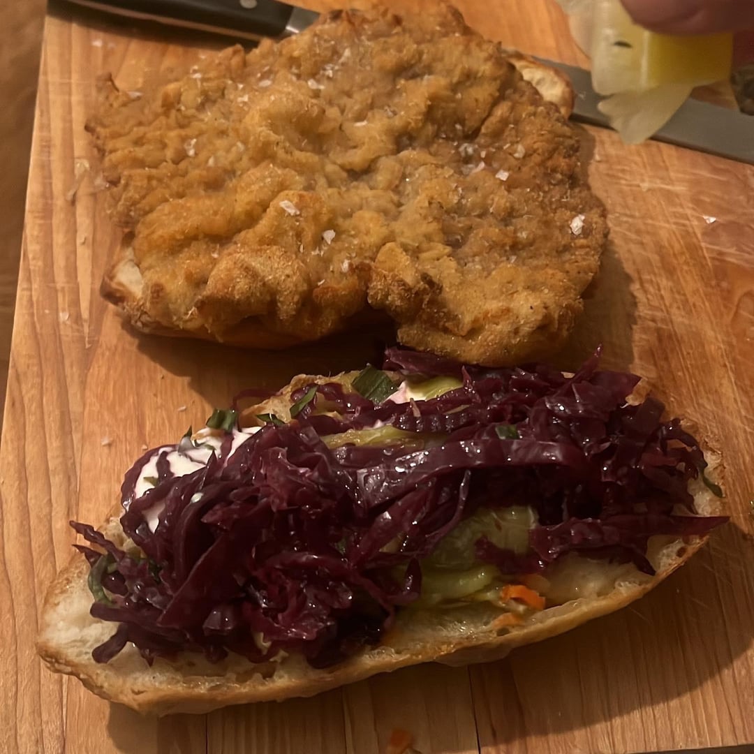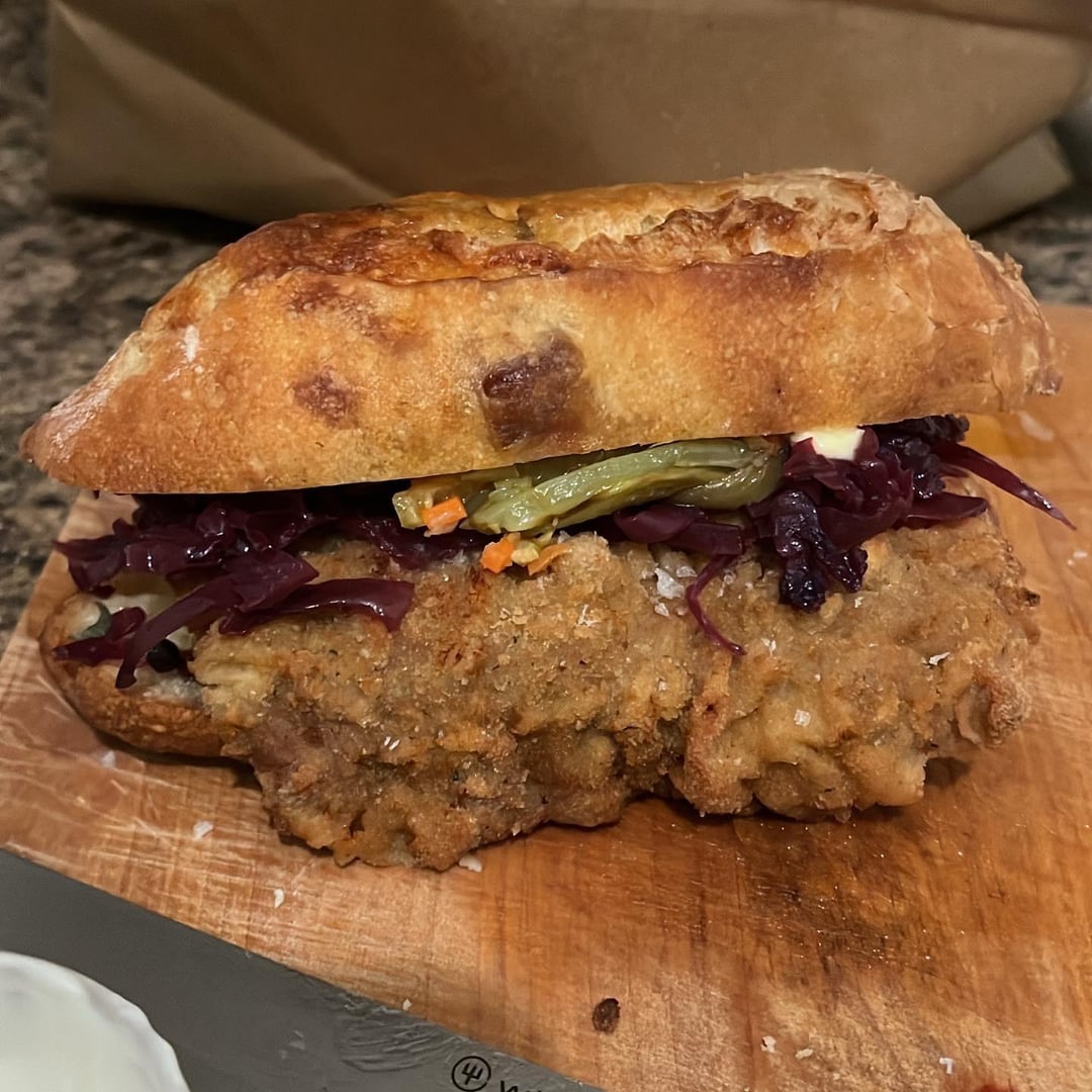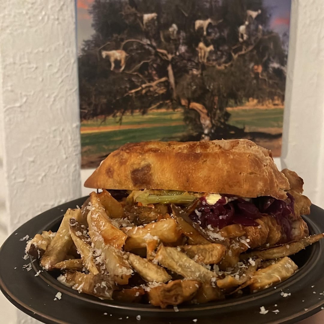 Balaton Wiener schnitzel on an on the rise bacon and lardon baguette with isigny spring butter, a blob in the center of spicy giardiniera and fried Hungarian peppers with fermented peppercorns, tiny bit of paprikash sauce, sour cream, braised red cabbage, and squeezed lemon and maldon salt on the schnitzel with a side of Tommy’s fries remixed with truffle salt and parmigiana reggiano