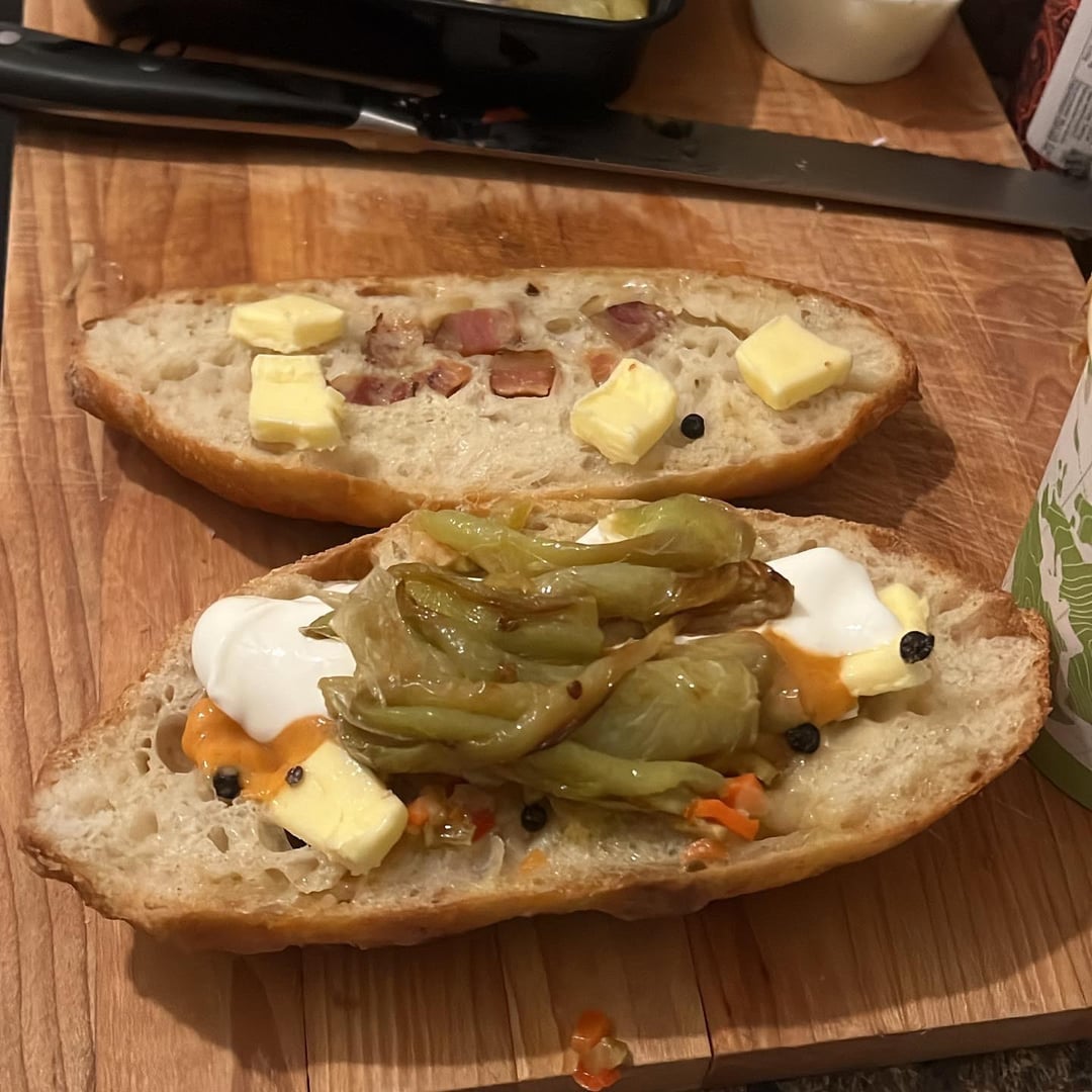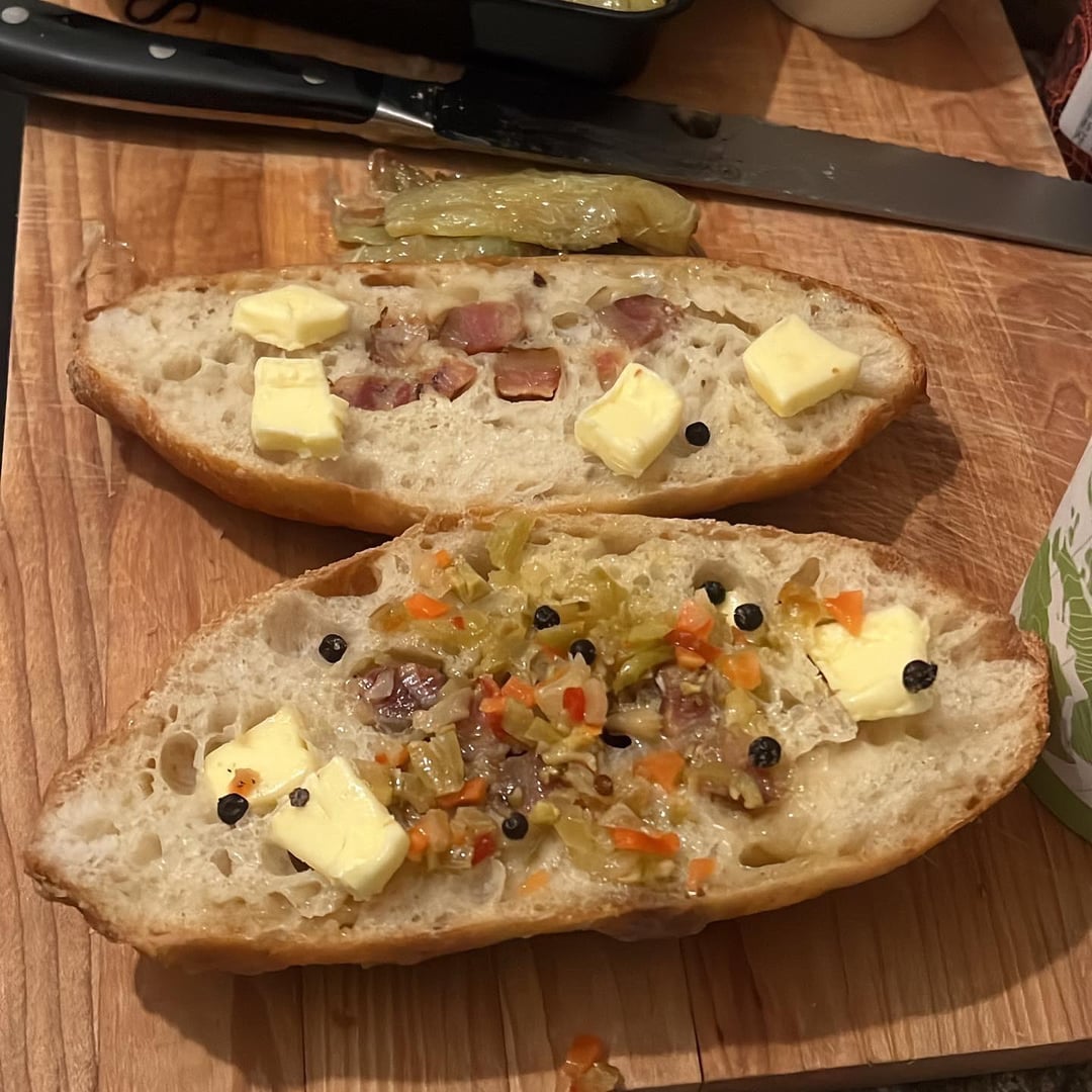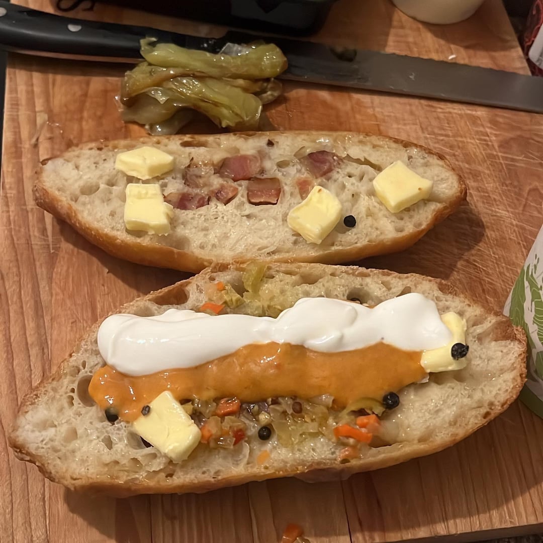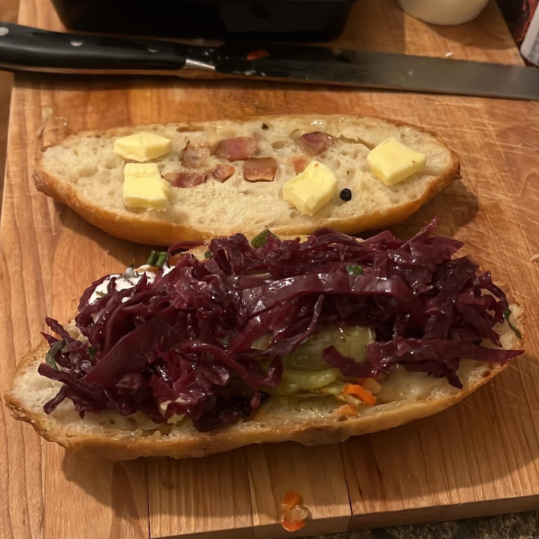 Balaton Wiener schnitzel on an on the rise bacon and lardon baguette with isigny spring butter, a blob in the center of spicy giardiniera and fried Hungarian peppers with fermented peppercorns, tiny bit of paprikash sauce, sour cream, braised red cabbage, and squeezed lemon and maldon salt on the schnitzel with a side of Tommy’s fries remixed with truffle salt and parmigiana reggiano