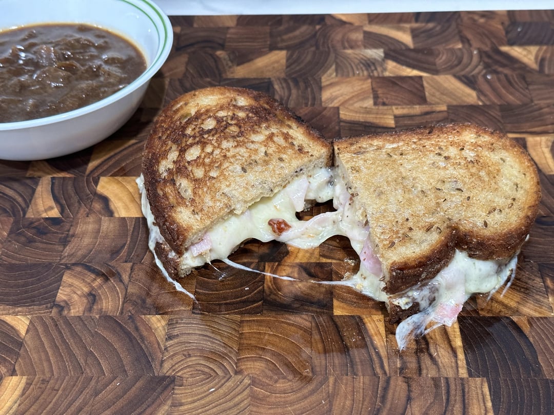 polish ham, vermont white cheddar, dijon, african devil (birdseye) peppers on rye. pan fried in clarified bacon grease w/ chips and homemade french onion soup
