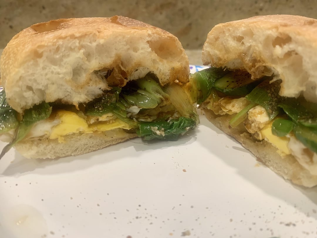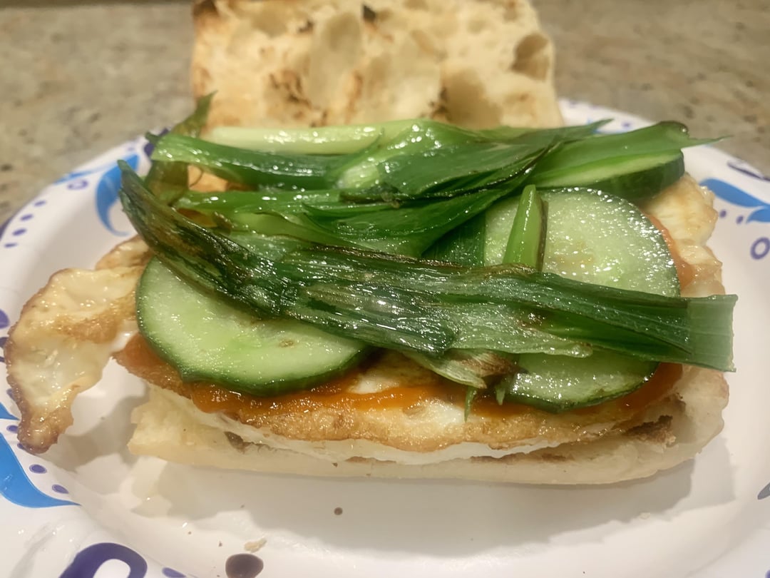 I was craving something a little different this morning. Here’s a sandwich with two fried eggs, fried cucumbers, and green onions, La Choy soy sauce, and the elusive HF Sriracha on a toasted Walmart ciabatta roll. It definitely hit the spot.