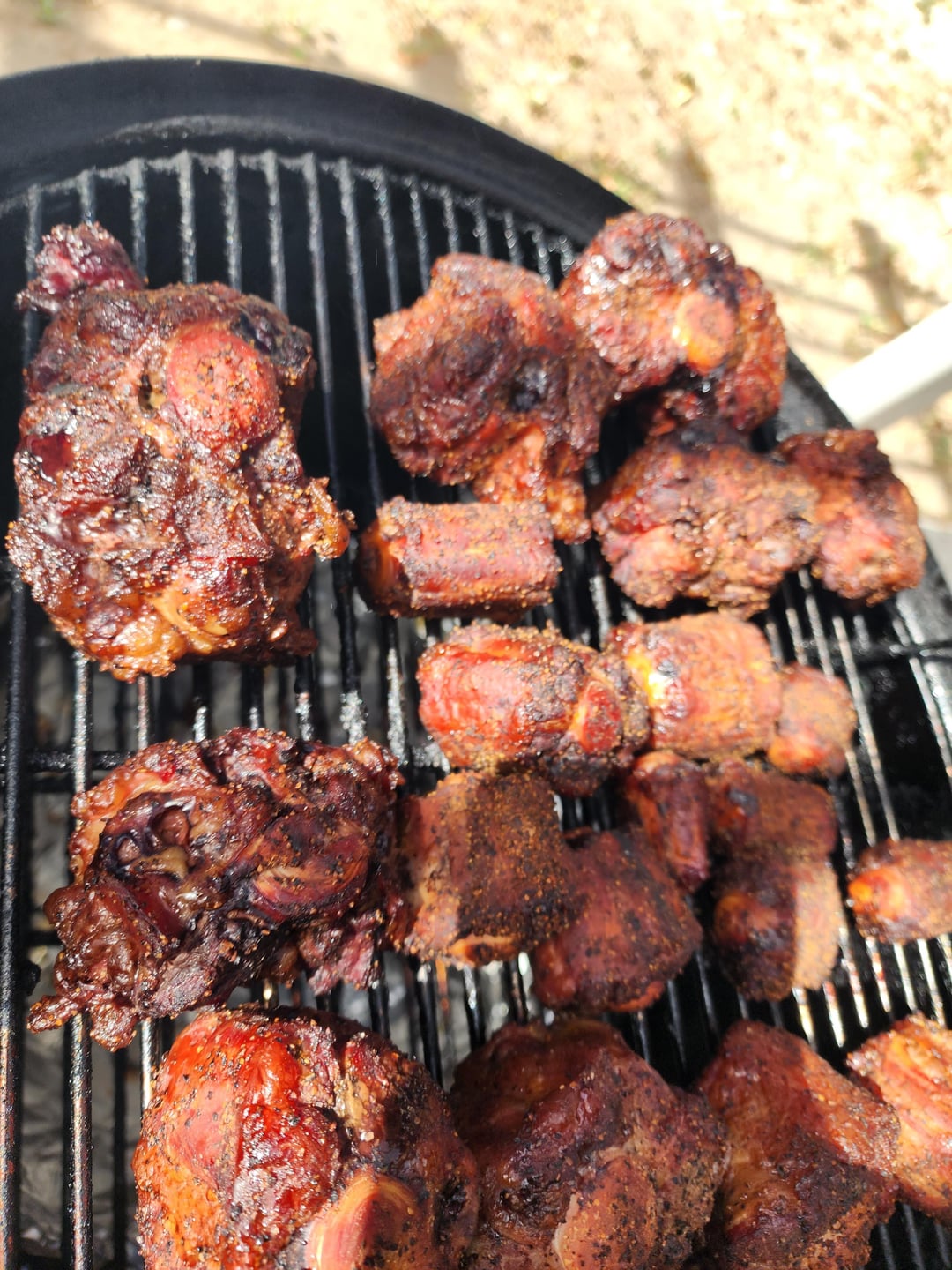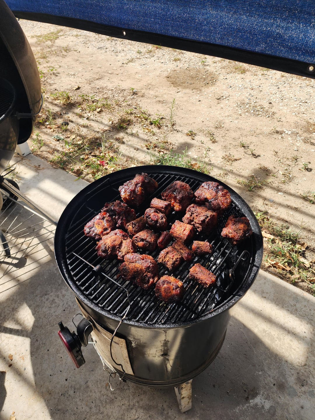 SPG rub (my own) smoked on 18 WSM with pecan and apple chunks, for 3 hours then used Malcom Reed’s braisig liquid recipe for 2 hours fork tender then with some jasmine rice. Good eating.