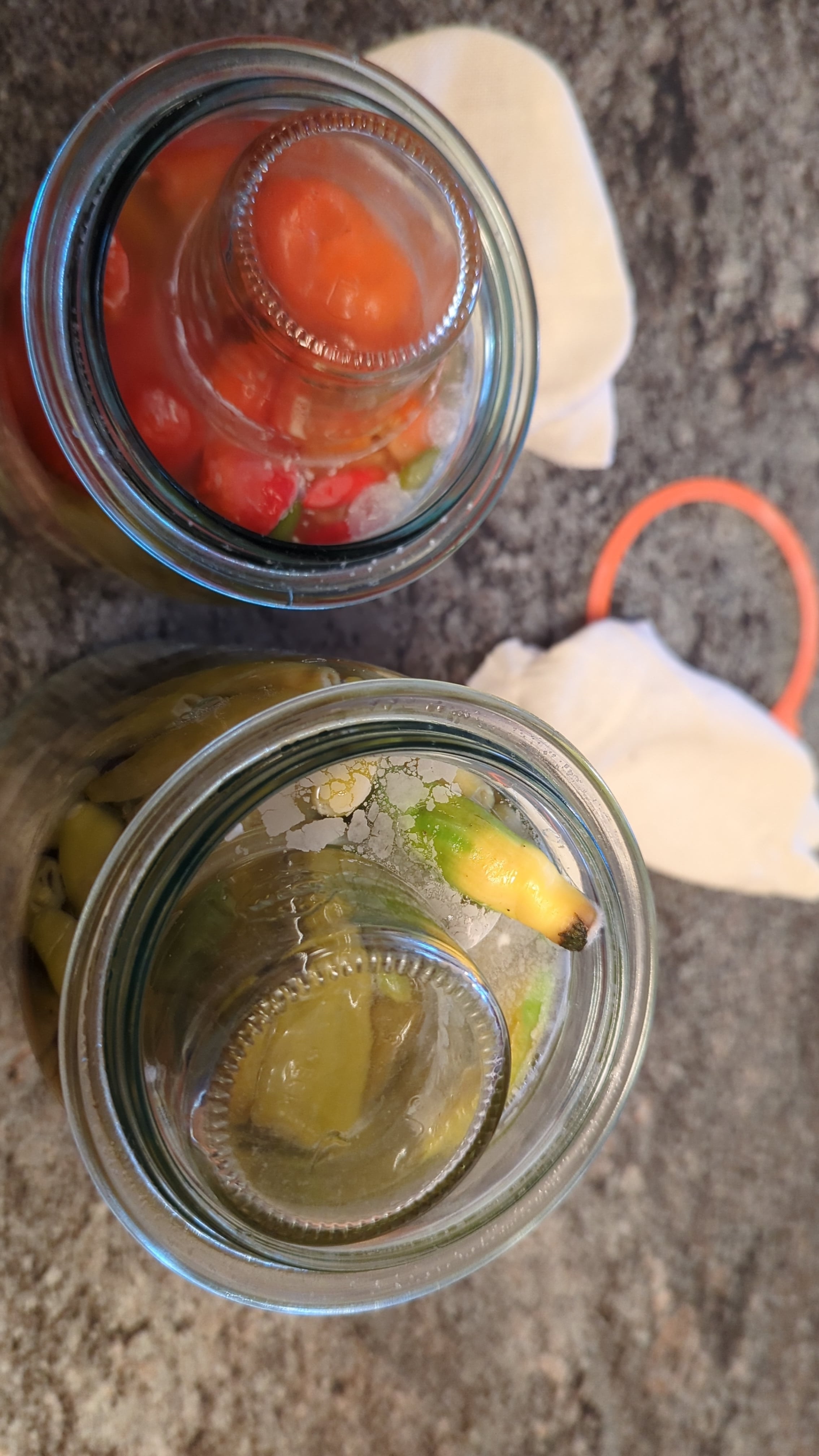 I wanted to ferment some peppers to make hot sauce. I used the smaller glass jars with some cheesecloth and a rubber band to push everything under the brine but apparently some peppers surfaced due to the fermentation. I’m scared that the white parts are a health risk.