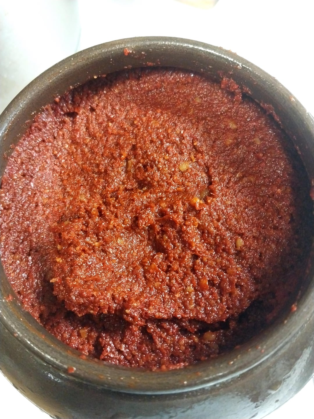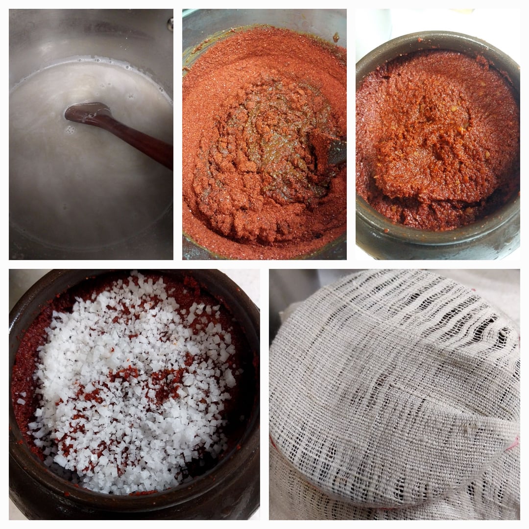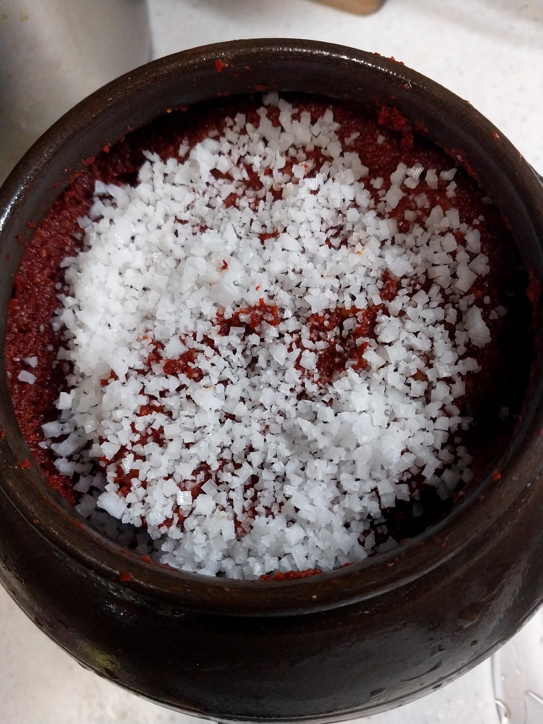 6.Mix 2 cups of meju powder, half a cup of sea salt, and 6 cups of red pepper powder for red pepper paste.