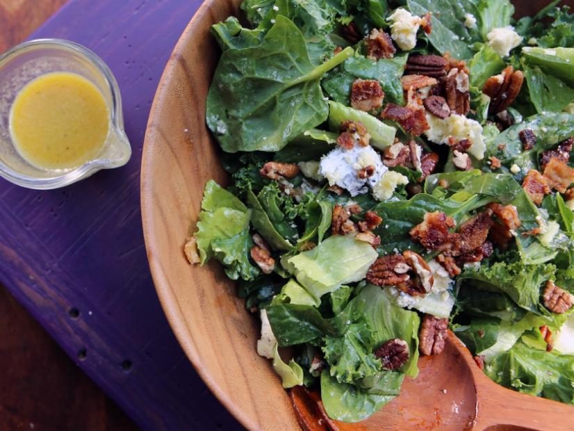 - In a small saucepan, heat walnut oil and vegetable oil over low heat until warm but not hot. Whisk in vinegar, salt and pepper. Place greens in a bowl and toss with the warm vinaigrette and the walnuts. Serve immediately.