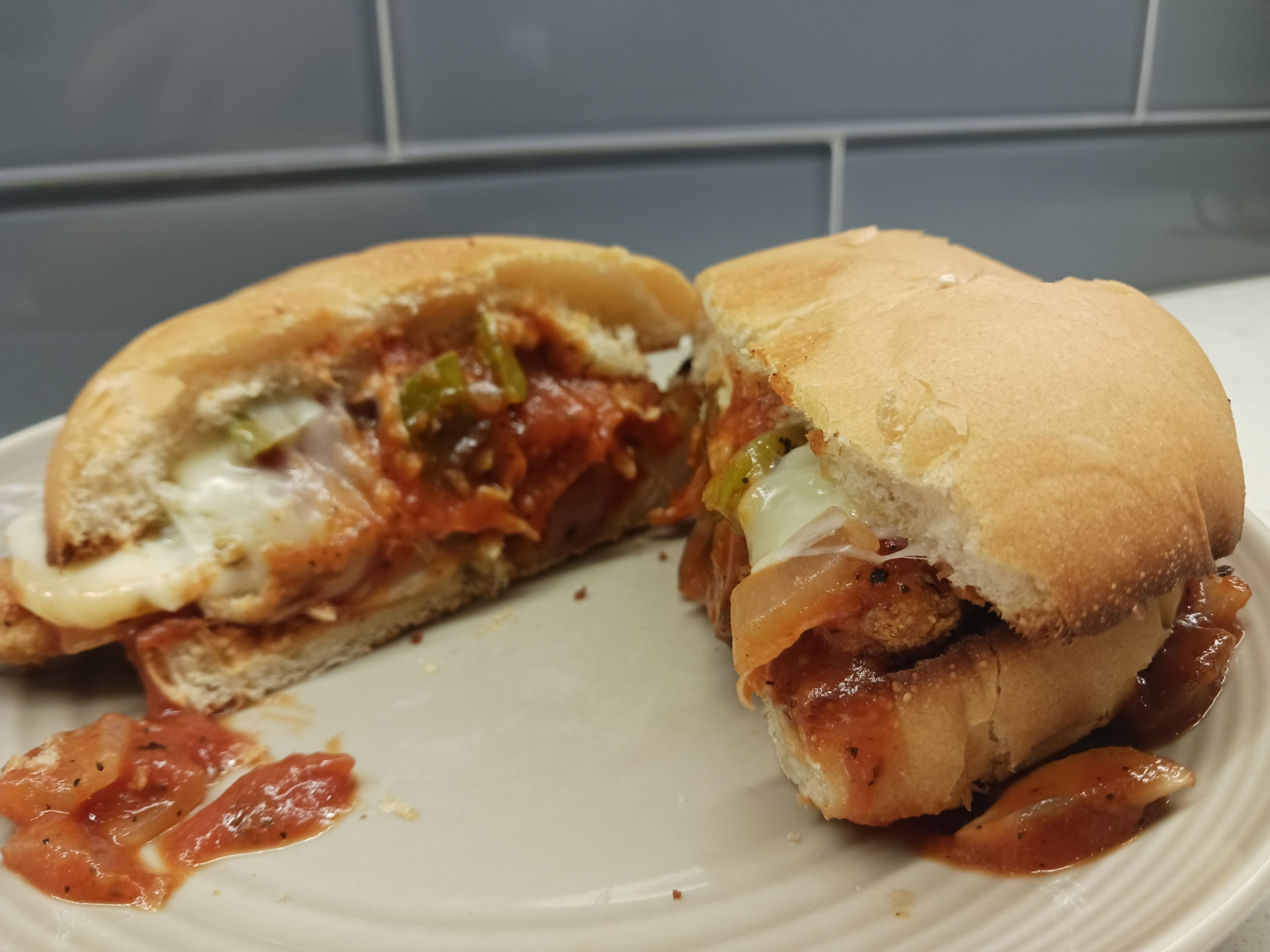 Air fryer chicken fingers, marinara sauce, onions, mushrooms and peppers and pepperjack cheese on a kaiser roll.by grimroseblackheart Write A CommentYou must be logged in to post a comment.