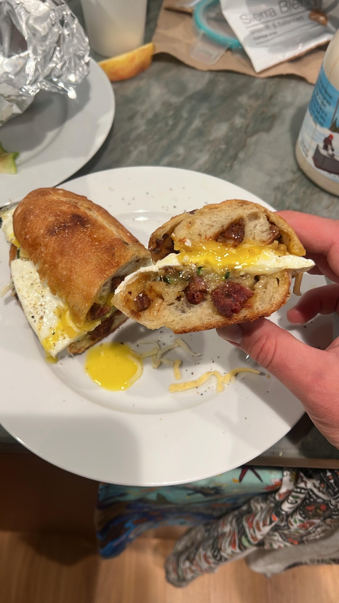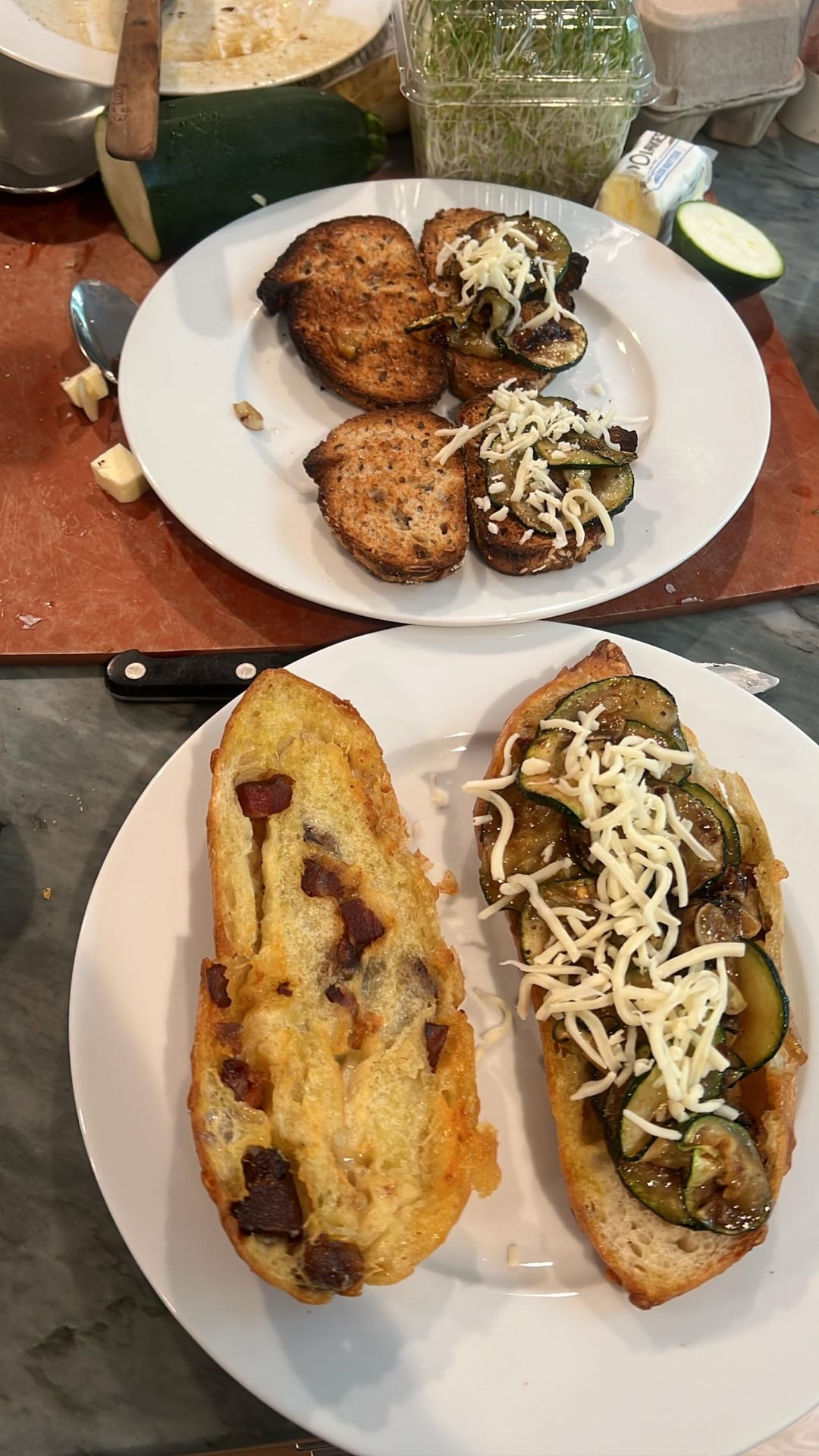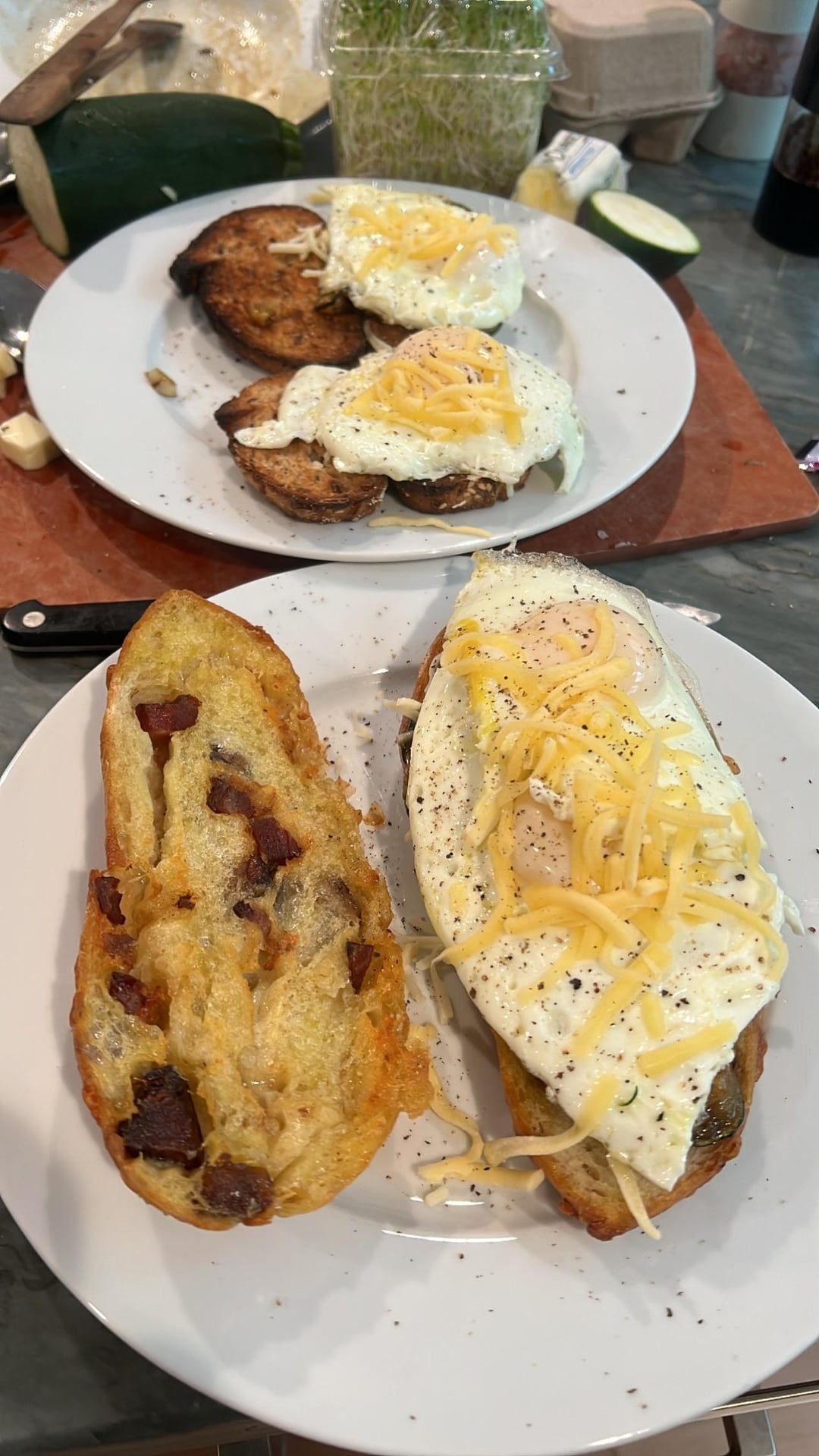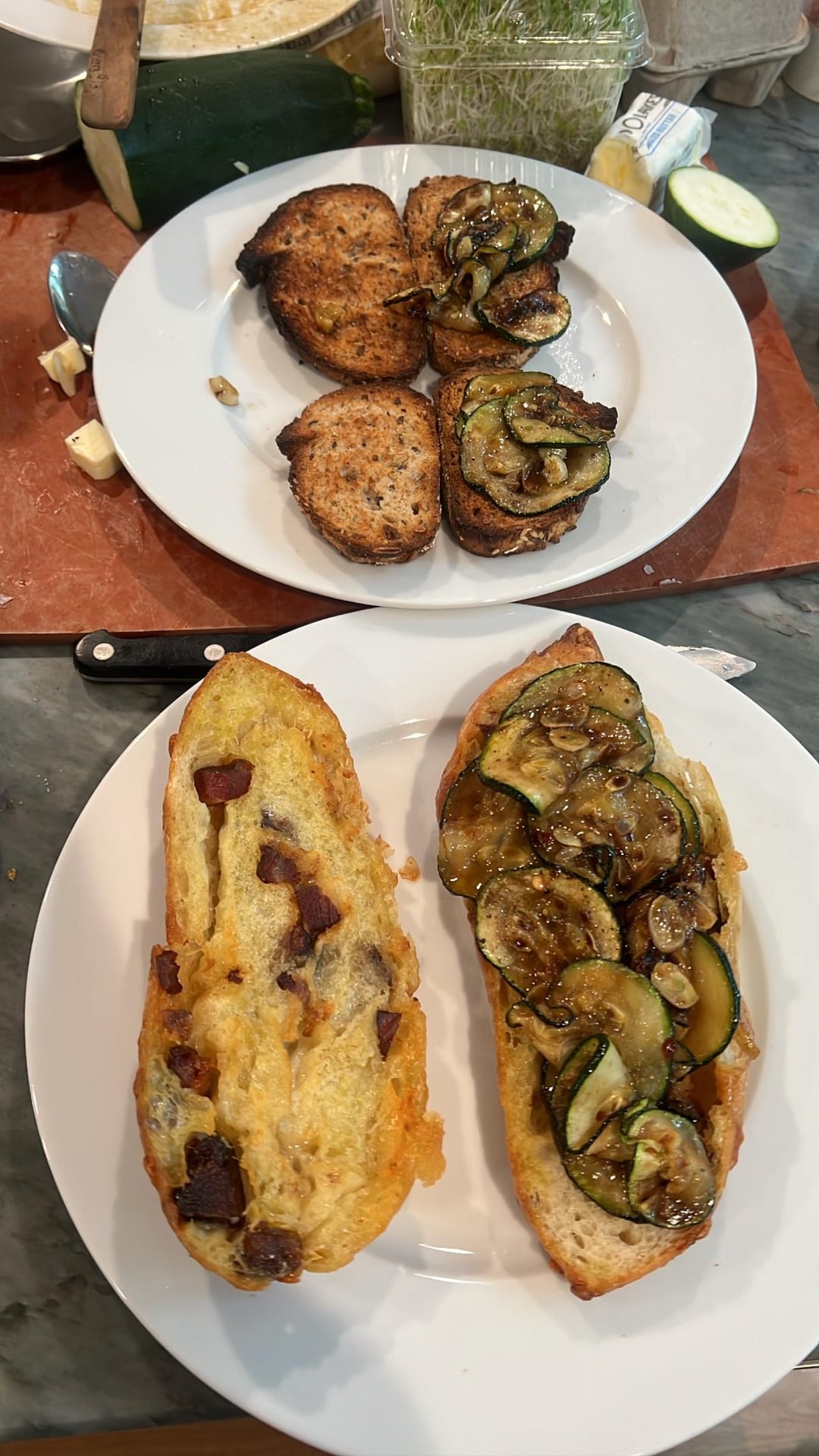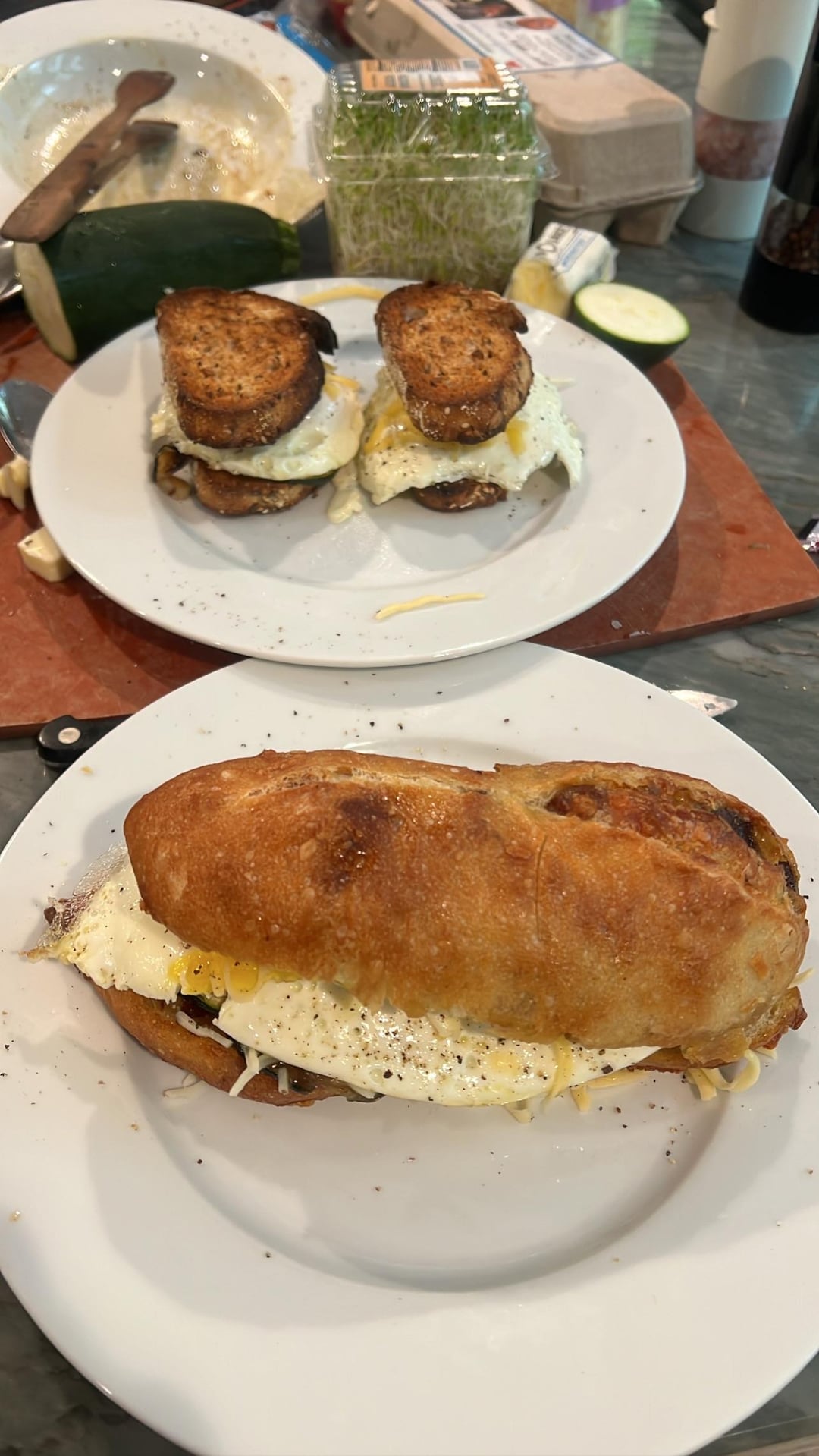 Breakfast sandwich on a bacon lardon and Gruyère baguette with 2 eggs and sautéed zucchini and garlic cooked with evoo, coriander, chili flakes, balsamic, maple syrup, pepper, salt, and butter with a cheese mix of shredded mozzarella and Gouda