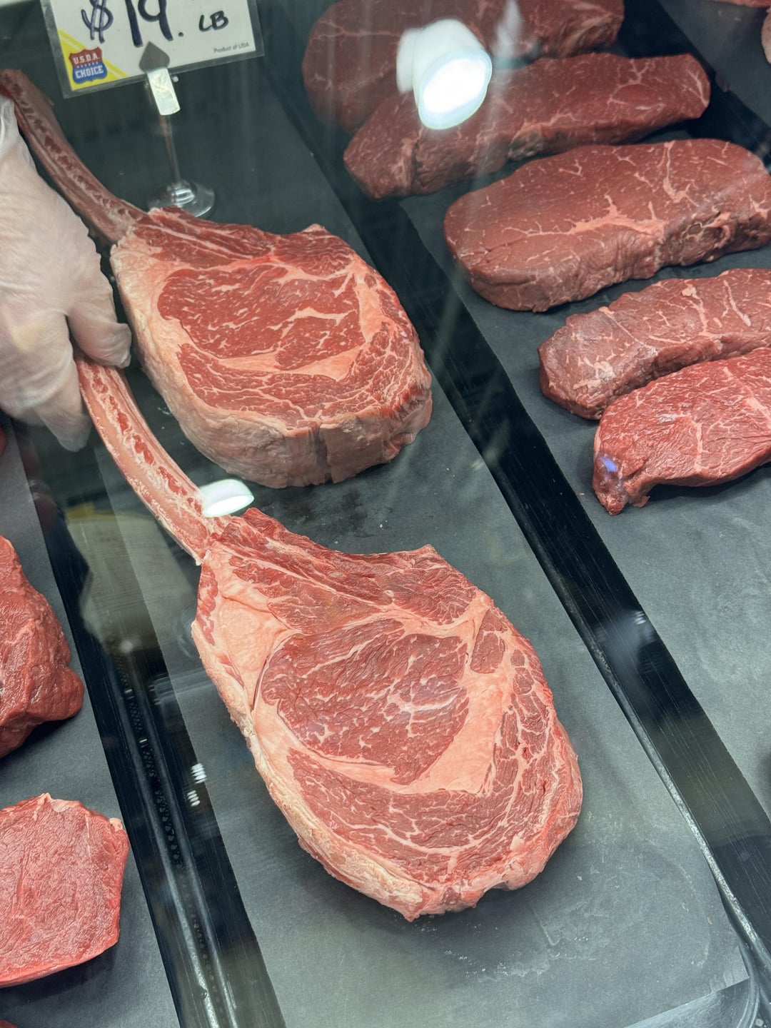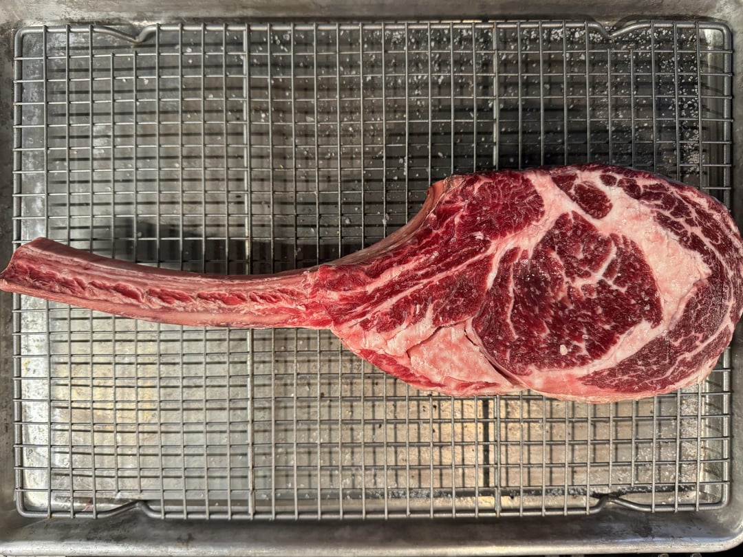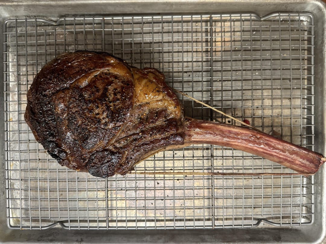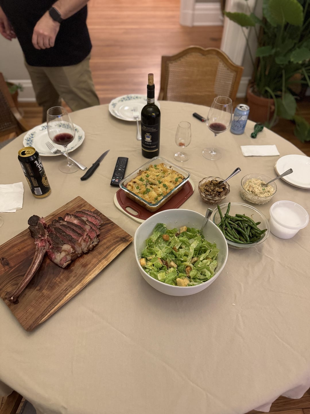 Tomahawk steak, Caesar salad, baked Mac and cheese, chili crisp wok fried green beans, sautéed onions and shitake mushrooms, and crab Oscar topping. Paired with Monday night football and a 2017 Brunello.
