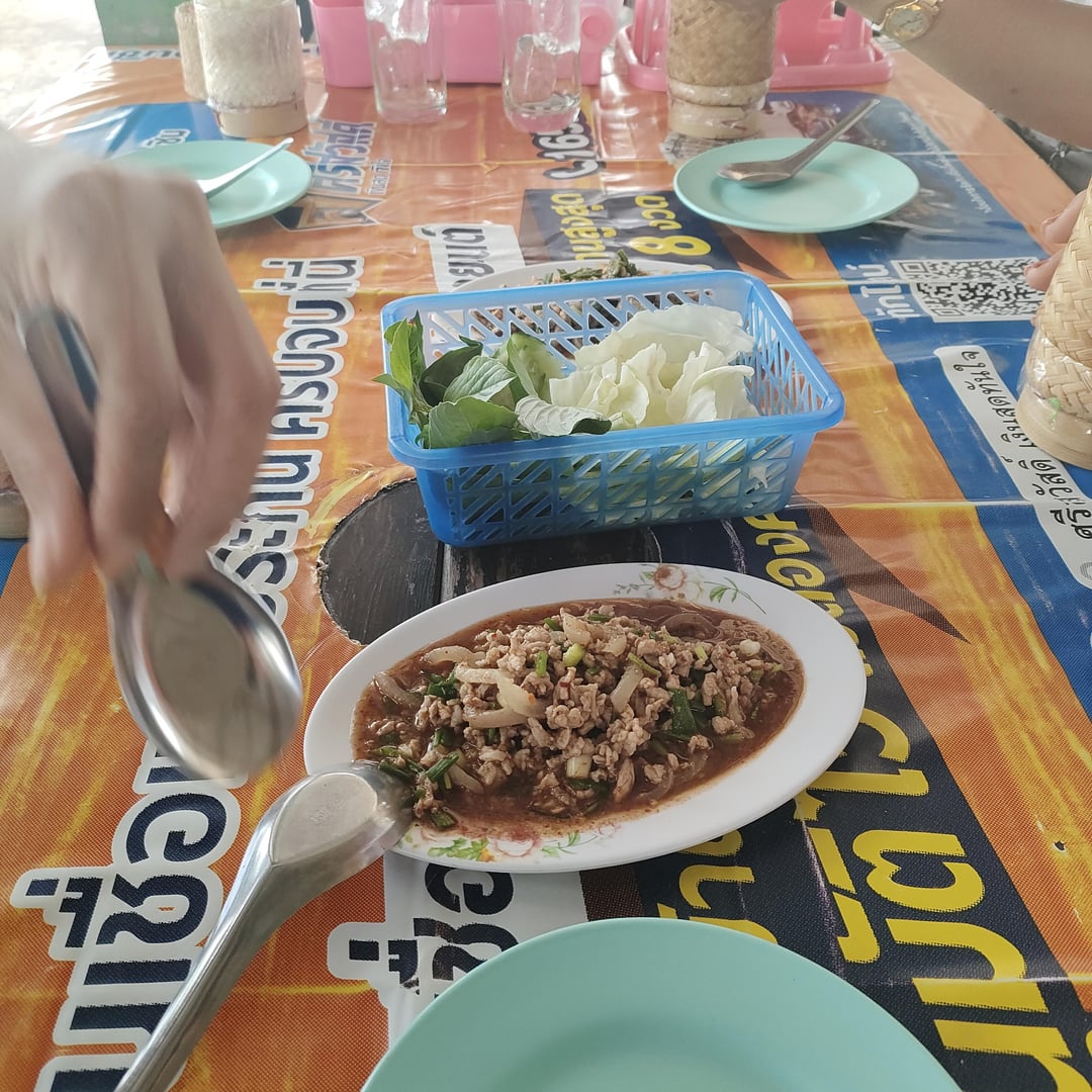 Moo pork, fried pork with vegetables and sticky rice. Literally sitting on the side of the road in chaiyaphum Thailand. Oh yeah I forgot the beer.