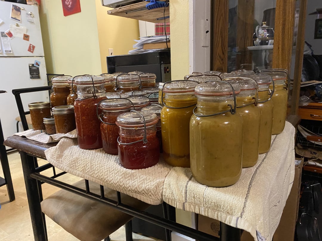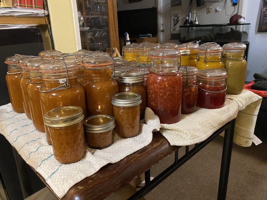 Just finished a canning marathon yesterday! Spicy Bbq sauce, tangy bbq sauce, honey bbq sauce, strawberry habenero jam, strawberry mango habenero jam, habenero hot sauce, hot pepper mustard, and hot pepper honey mustard šµ