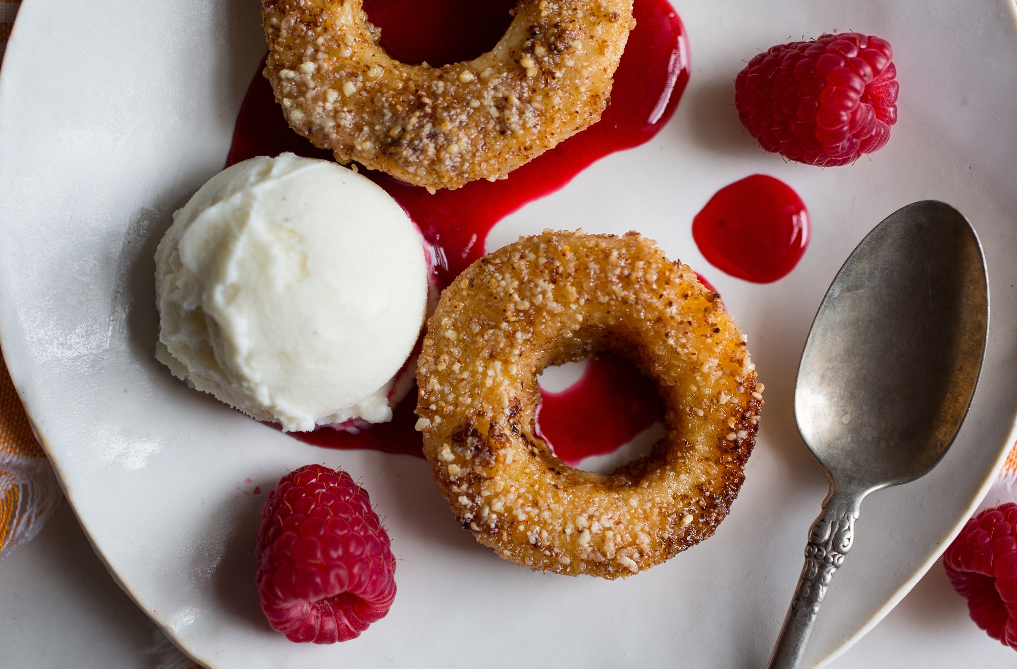 These doughnuts are pure fruit. They are inspired by a baked pistachio-encrusted Saturn peach doughnut I learned to make from the pastry chef Sherry Yard. I coat mine with a mix of ground almonds and raw brown sugar, sear them in butter and set them on a lime-inflected raspberry sauce. It’s a match made in heaven.
