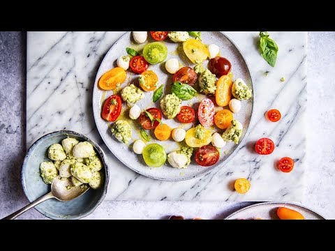 Print out this recipe at: https://vikalinka.com/basil-pesto-caprese-salad/
