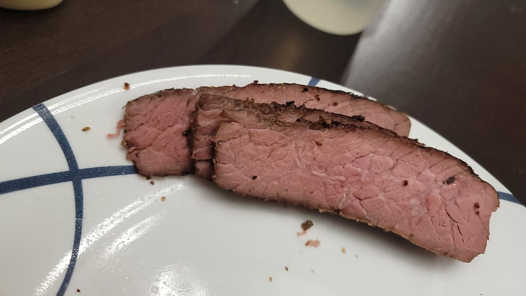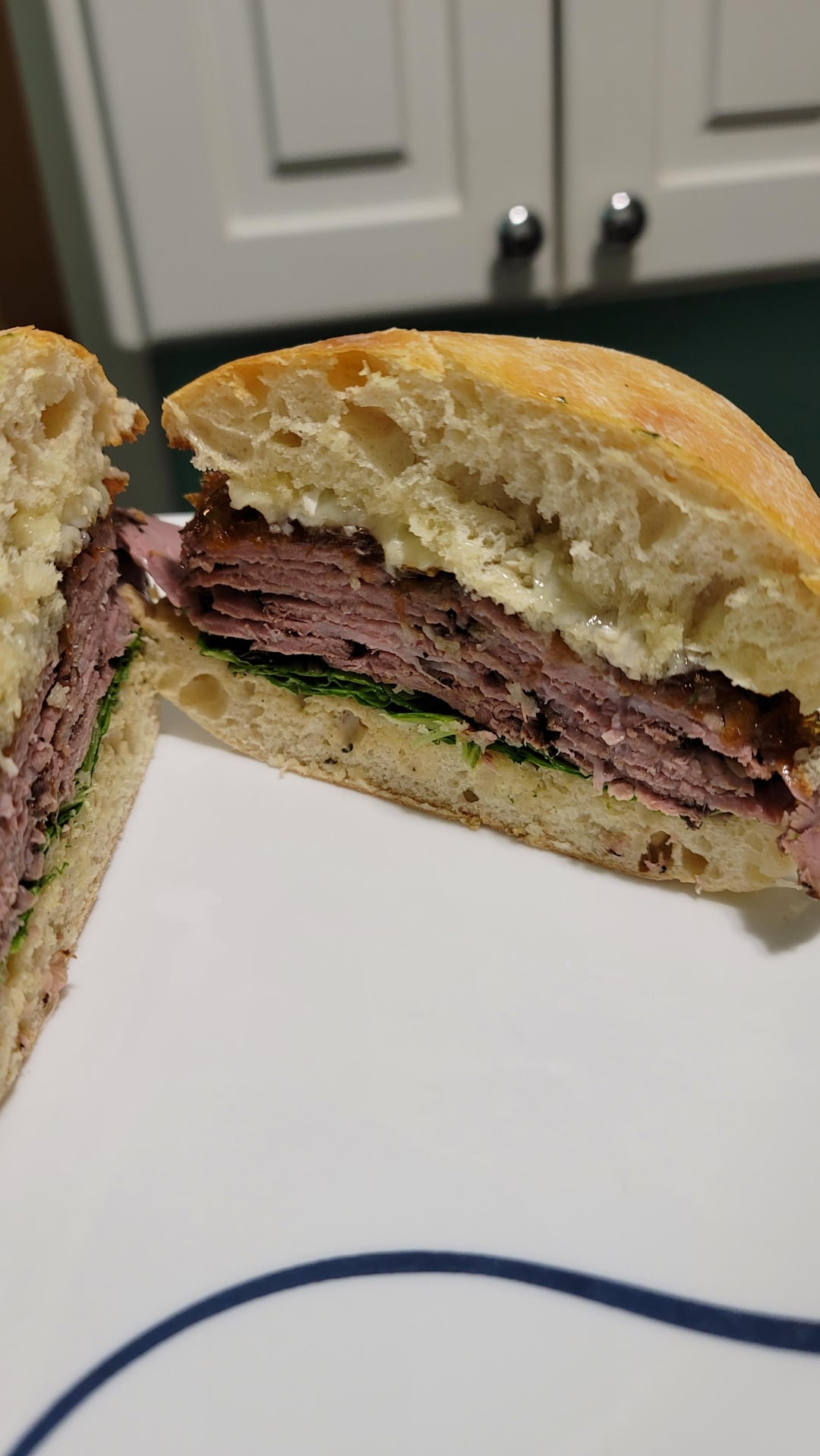 home made roast beef- London broil cooked sous vide for 24 hours, then into the dehydrator for 30 mins at 130 to dry the outside then into a screaming hot pan to get a good crust. I seasoned it with Montreal steak seasoning, and also mixed some liquid smoke into butter that I slathered all over it. The sandwich is toasted focaccia with a sauce I made- mayo with horseradish, truffle, black garlic, white wine vinegar, rosemary, and thyme. Then arugula, the meat, caramelized onions (1 hr), and brie. Shaved the meat on my deli slicer after letting it chill in the fridge overnight.