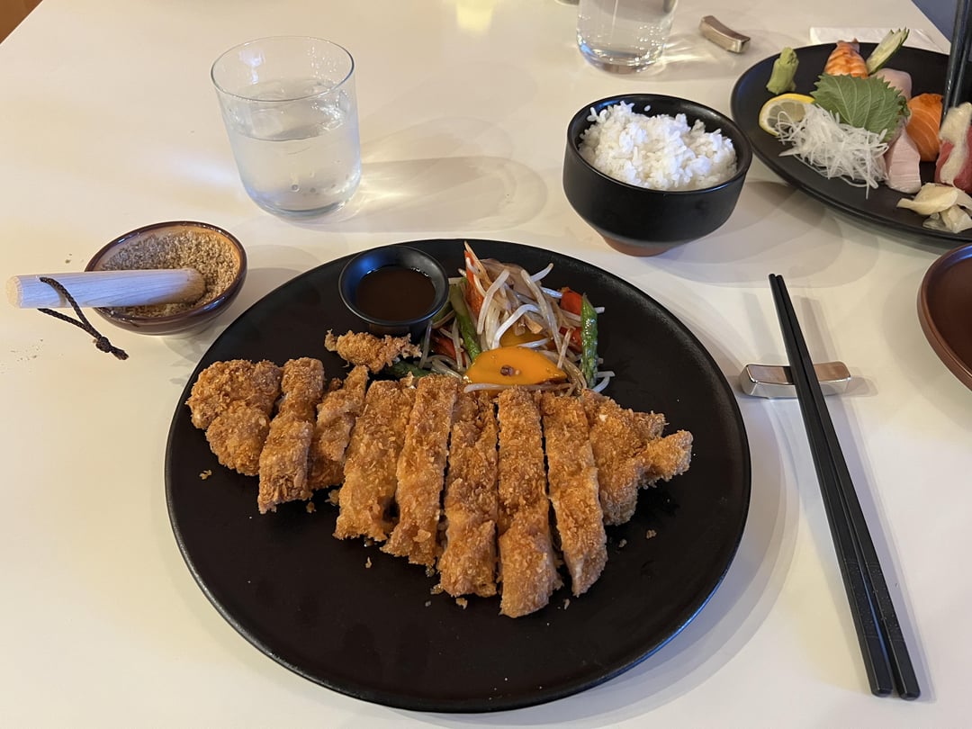 I opted for the Tonkatsu and my boyfriend had the sashimi lunch special. Both of our dishes came with miso soup and a fresh salad with tomatoes and avocado. The Tonkatsu came with a side of white rice, an assortment of sautéed peppers, mushrooms and asparagus, sauce, and toasted sesame seeds that can be ground and added to your liking. The pork was thick, tender, and very juicy.