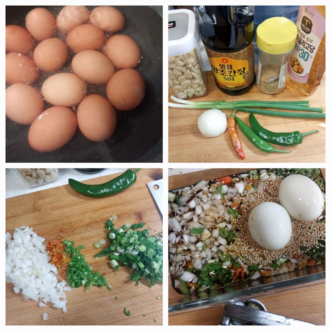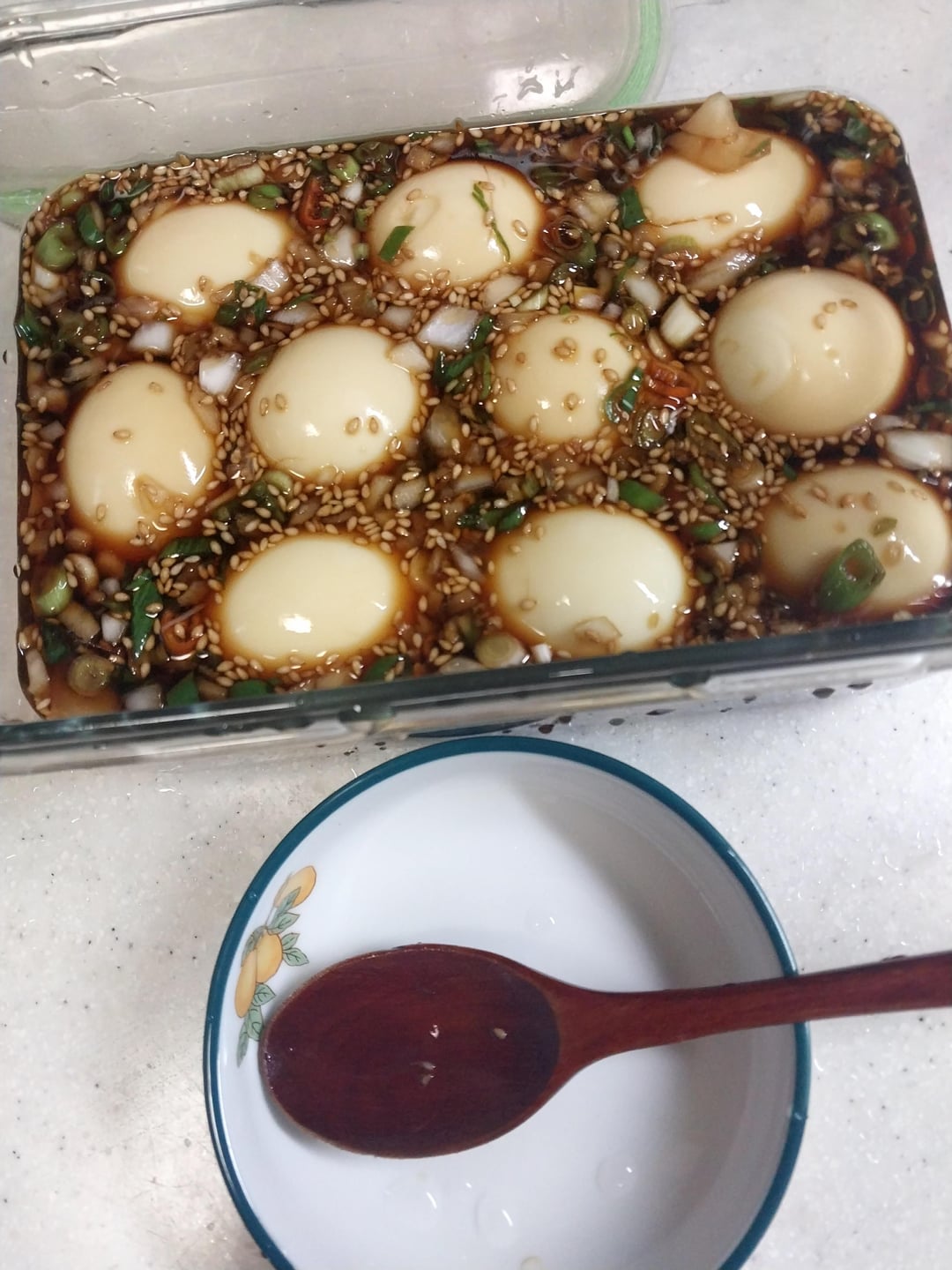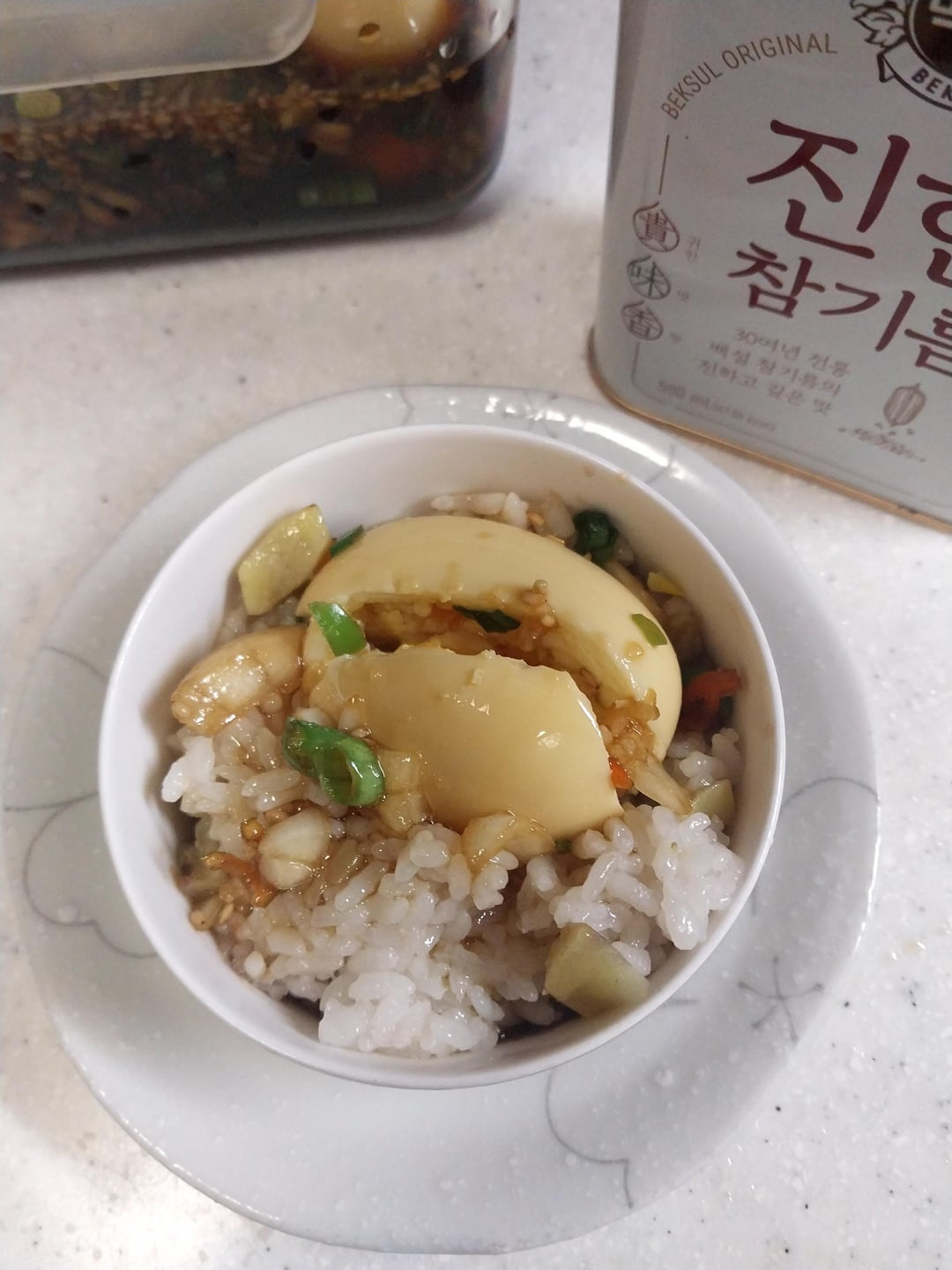 4.Add boiled eggs. You can eat it after two to three hours when the soy sauce changes eggs color. You can adding sesame oil and mixing it when eating.