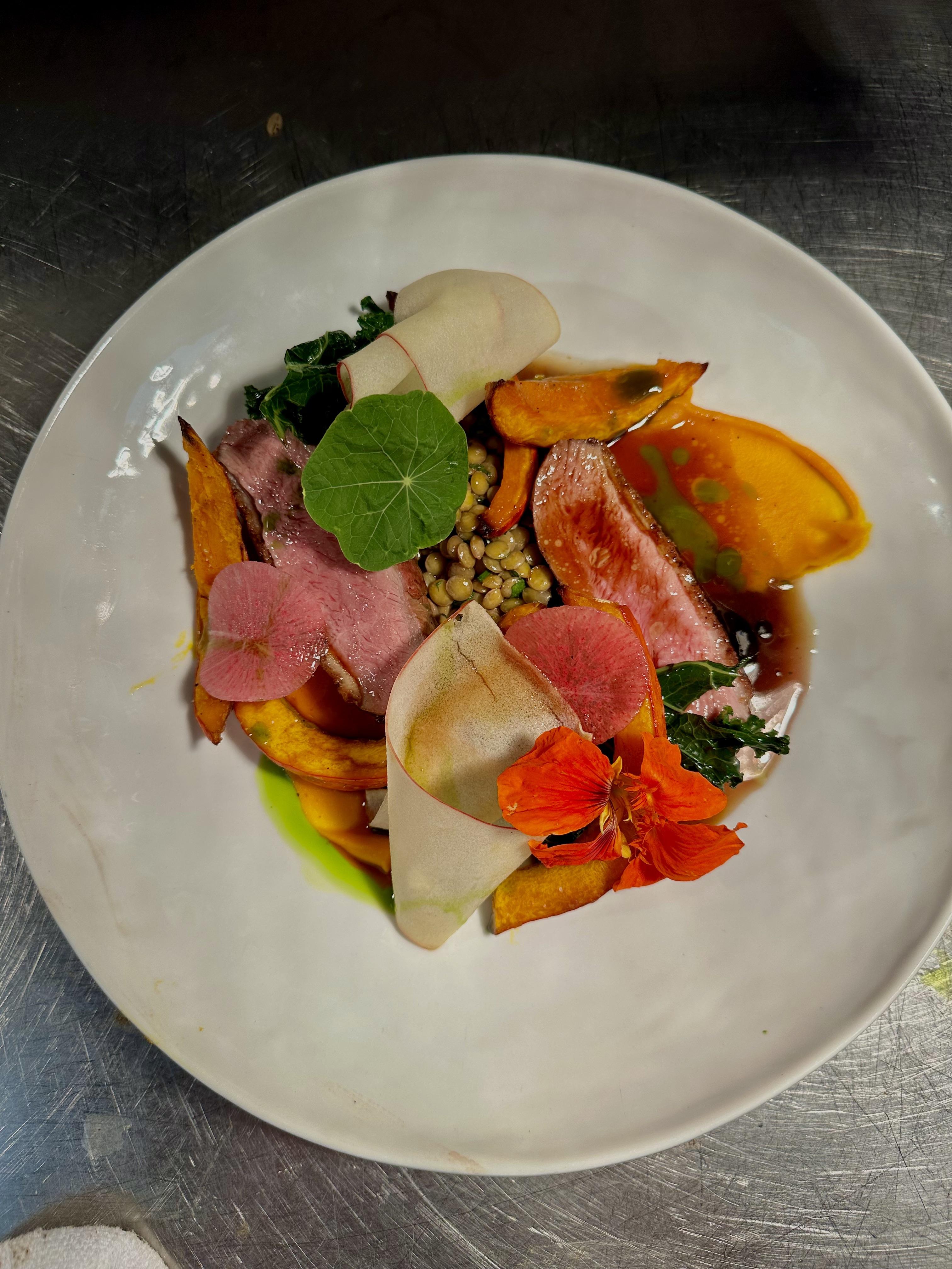 I would plate the same amount of puree, but in a thinner line so it stands up high. Spoon the lentils next to the puree, keeping them high and tight. Then nestle the duck breasts perpendicular to those two lines. Then artfully place the squash and kale. Skip the apple and nasturtium.