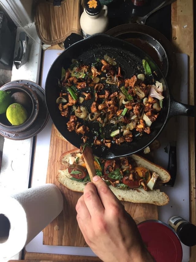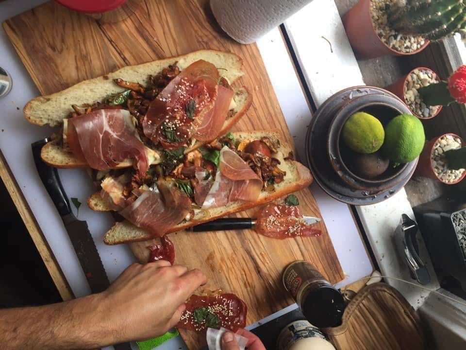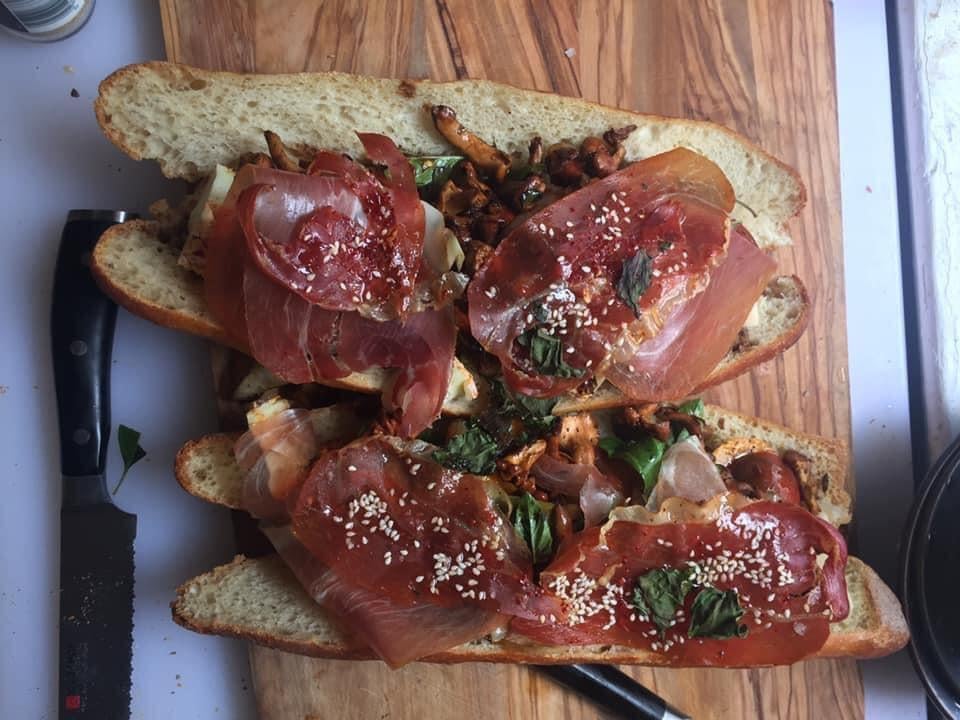 Sautéed chanterelles cooked with shallot, garlic, and fried and fresh basil cooked with fennel seeds, oregano, gochugaru, maple syrup, butter, and sherry vinegar sandwich on an ancienne baguette with Maple syrup and sesame seed baked la Quercia prosciutto and fresh prosciutto, vacherousse d’argental Brie, and maldon salt, evoo, and heavily peppered kumata tomatoes