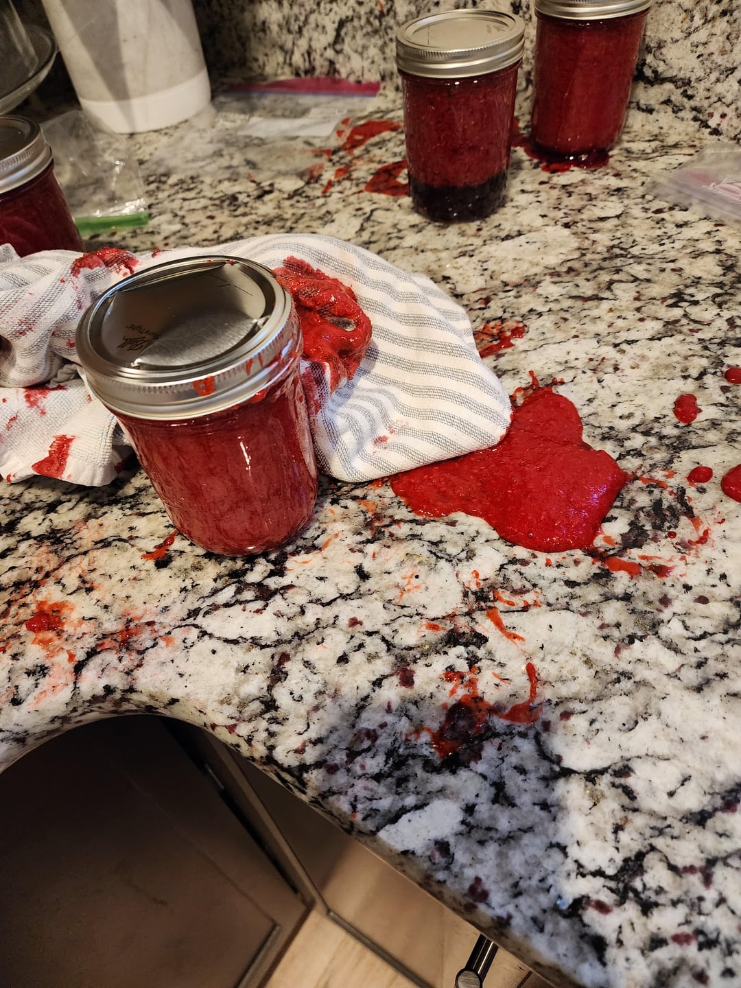The next batch we started using frozen berries, thawed in the fridge, and using the Less or No Sugar Sure Jell and followed the online recipe, again only using 2 cups of sugar to 4 cups of crushed berries. It seemed to be a lighter color from the get go and seemed like I had mixed air into it maybe? Anyways, the jars have been sitting on my counter for maybe a day and a half and this morning I notices leaking jam and the swollen lids. Any advice is welcome!