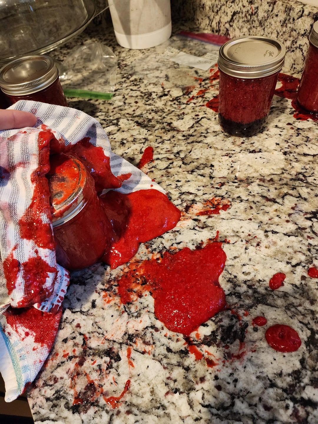 My jars of jam I made have basically exploded. I noticed this morning that the lids were severely swollen and so I put on safety glasses and used a towel to twist the lids off and they popped off loudly and the jam is oozing everywhere. It seems very foamy like it started fermenting. Followed the recipe from Sure Jell here: [https://www.myfoodandfamily.com/brands/sure-jell/recipe/057883/sure-jell-for-less-or-no-sugar-needed-recipes-red-raspberry-freezer-jam?categoryid=200043](https://www.myfoodandfamily.com/brands/sure-jell/recipe/057883/sure-jell-for-less-or-no-sugar-needed-recipes-red-raspberry-freezer-jam?categoryid=200043)